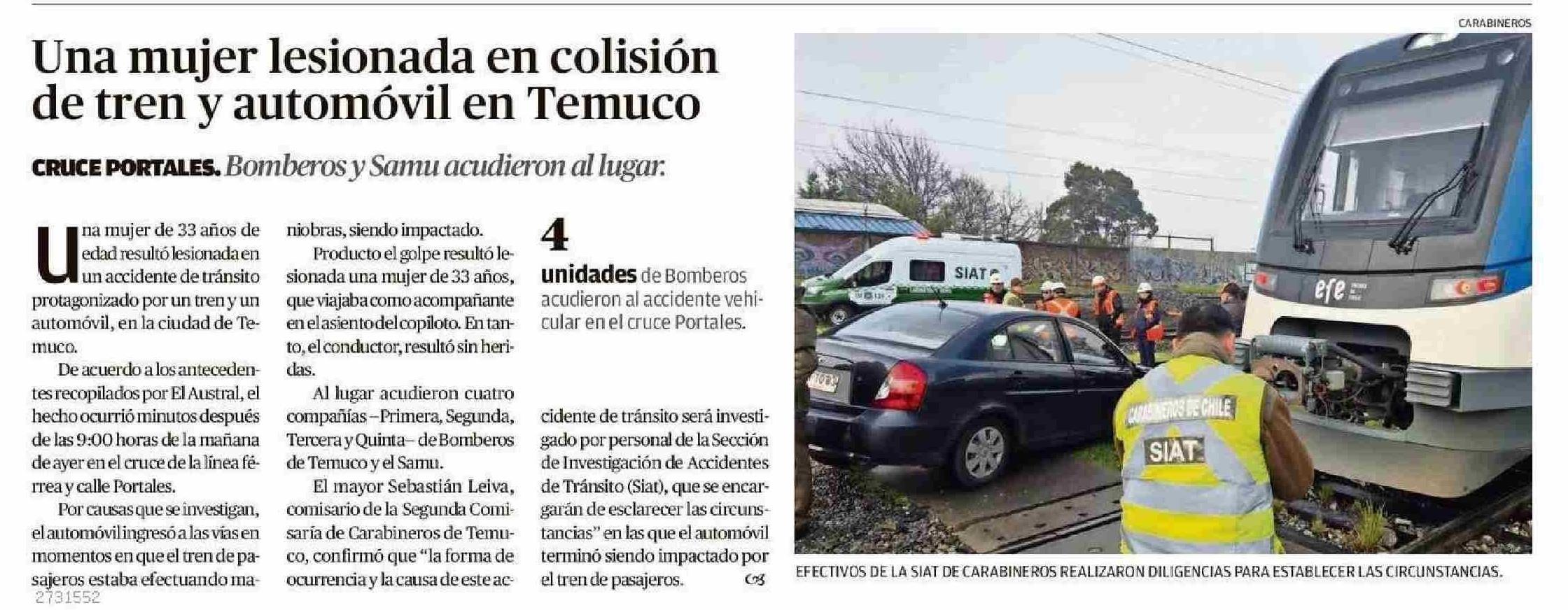 | Título: | Una mujer lesionada en colisión de tren y automóvil en Temuco |