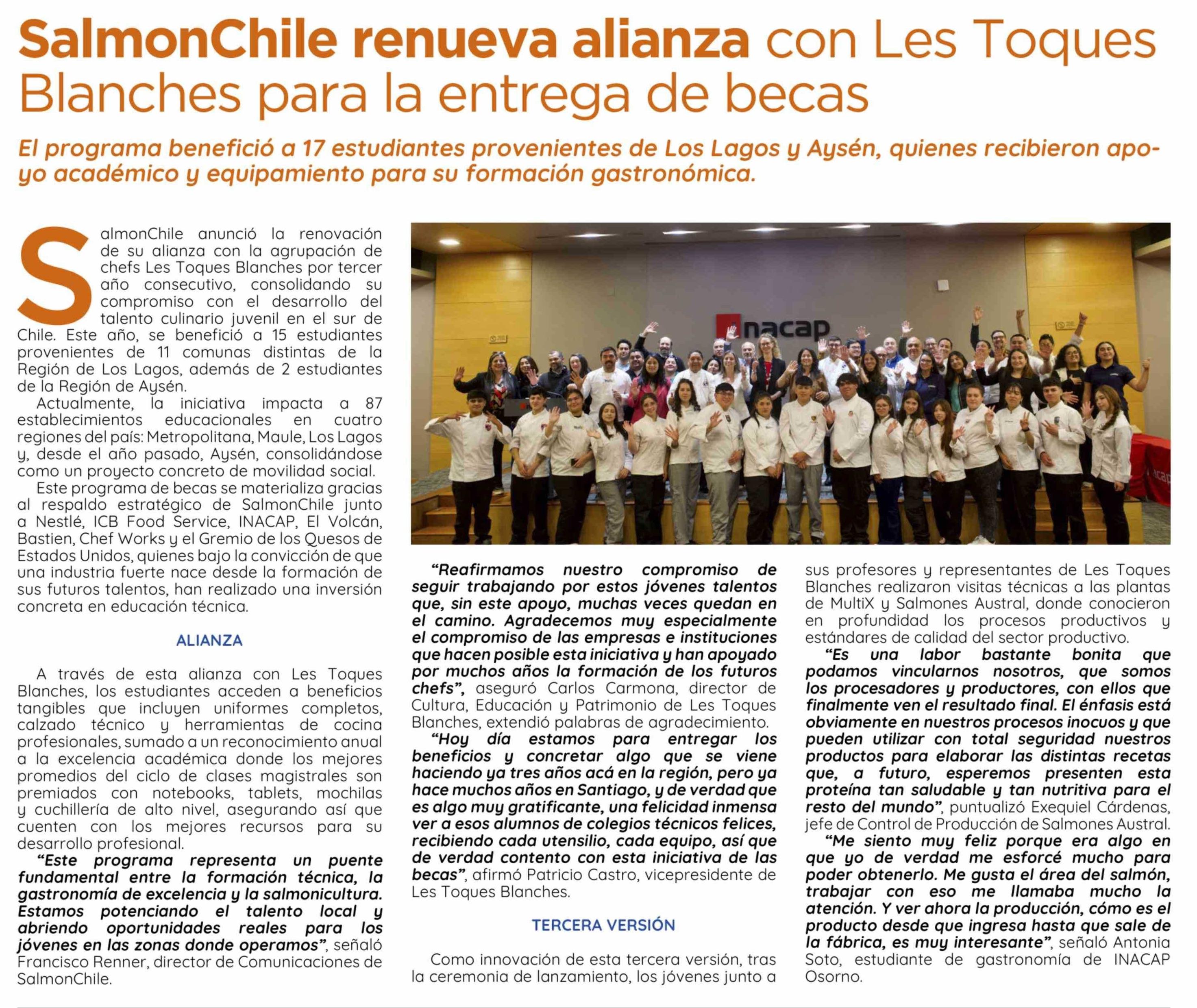 Título: SalmonChile renueva alianza con Les Toques Blanches para la entrega de becas