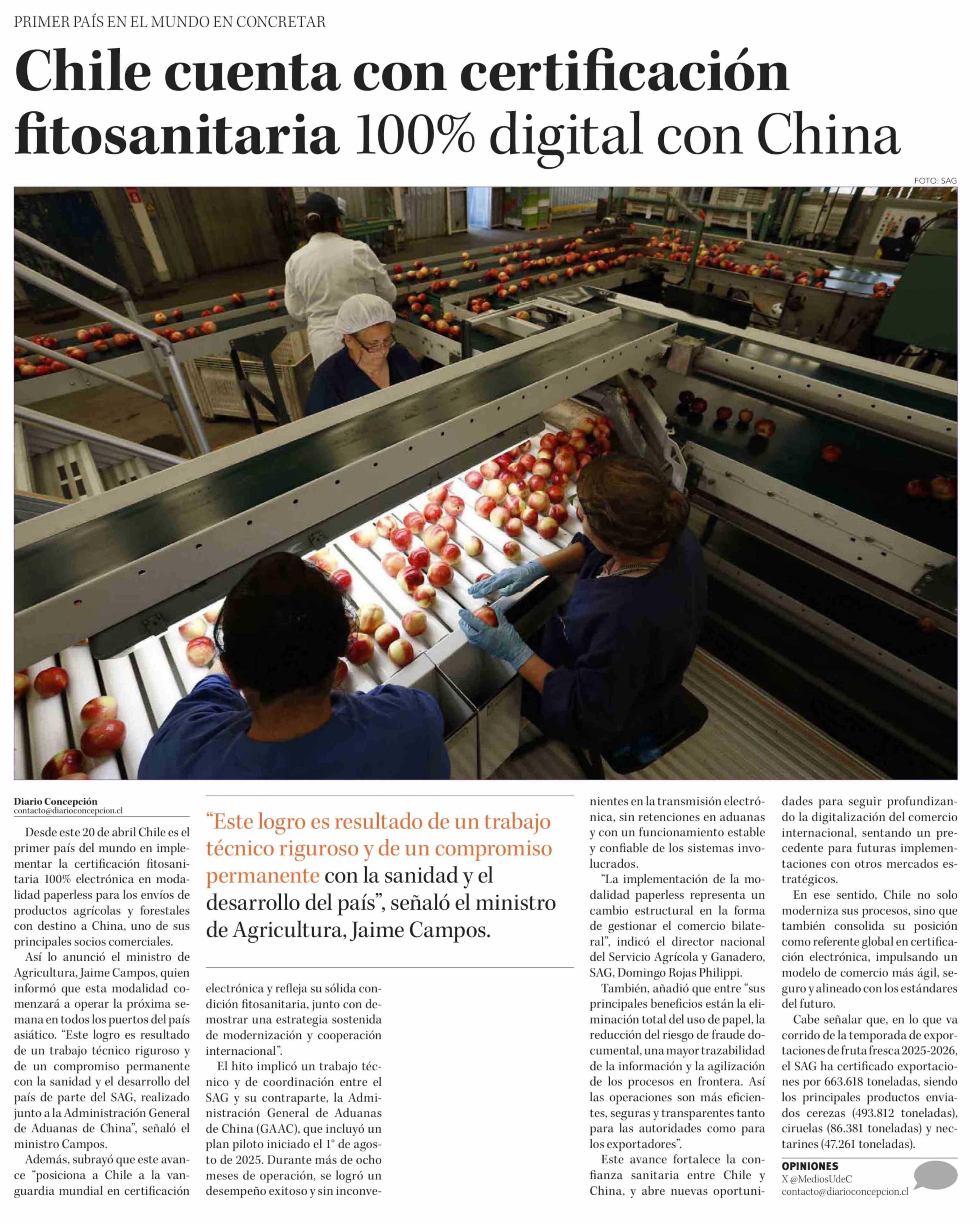 Chile cuenta con certificación fitosanitaria 100% digital con China 22-04-2026 Diario Concepción |