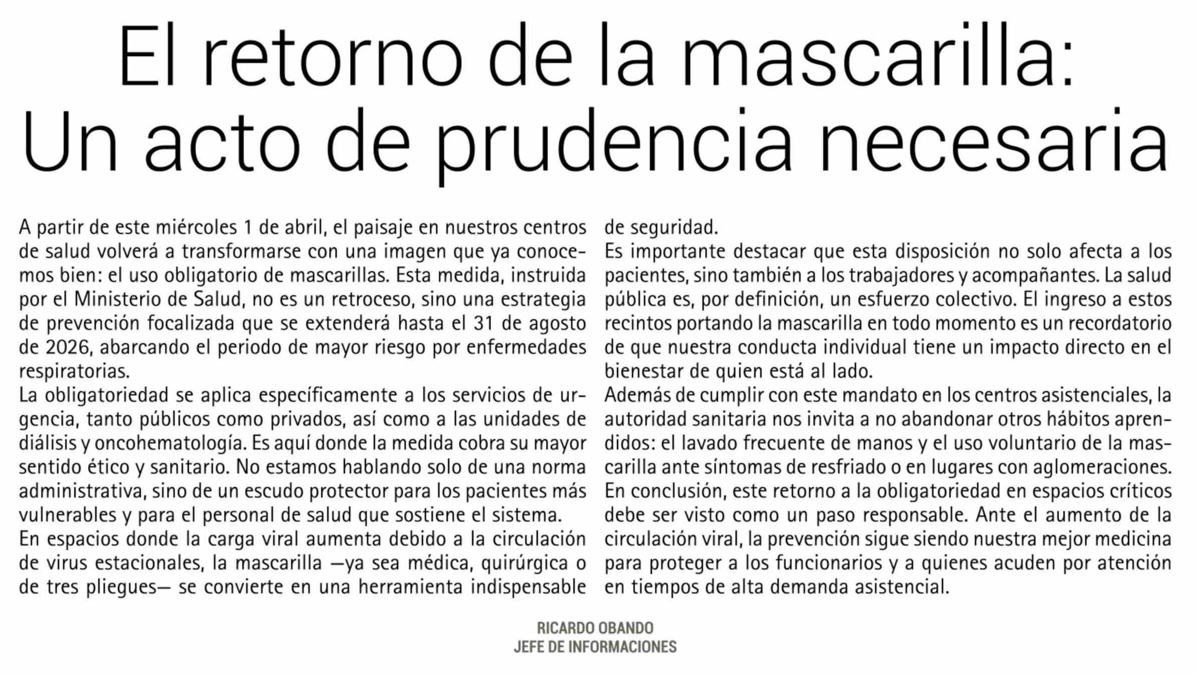 Editorial: El retorno de la mascarilla: Un acto de prudencia necesaria 01-04-2026 El Rancagüino |