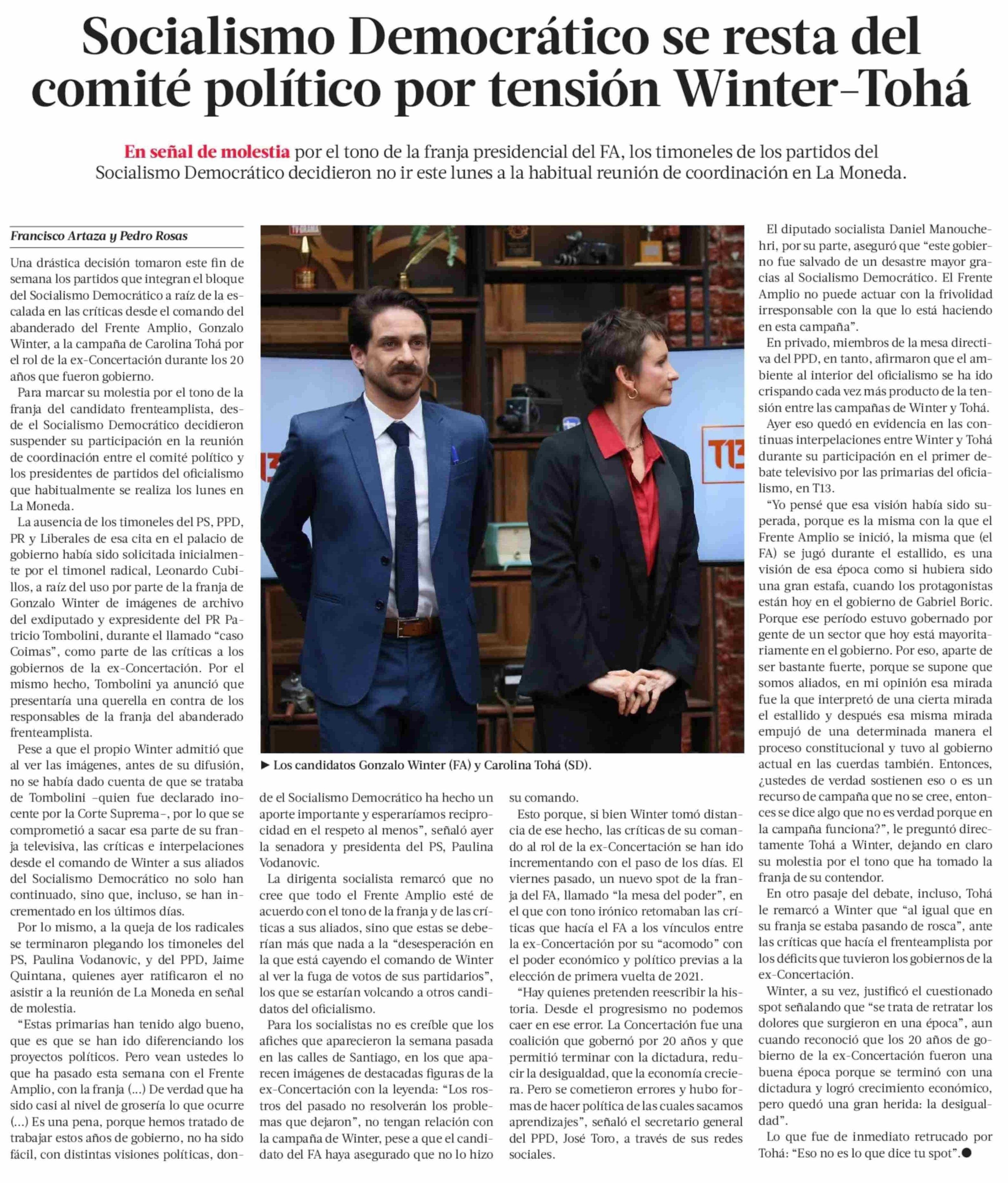 Socialismo Democrático se resta del comité político por tensión Winter-Tohá 16-06-2025 La Tercera |