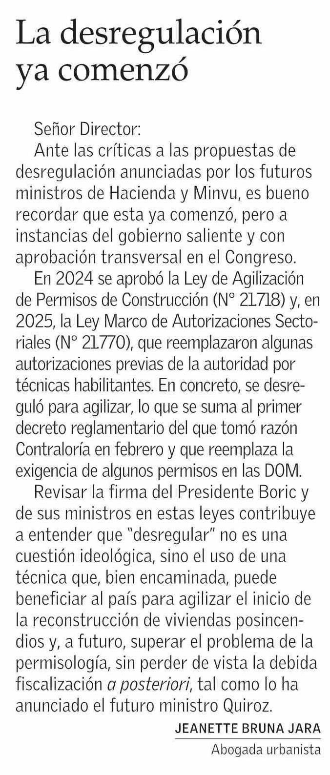 Cartas: La desregulación ya comenzó 12-02-2026 El Mercurio |