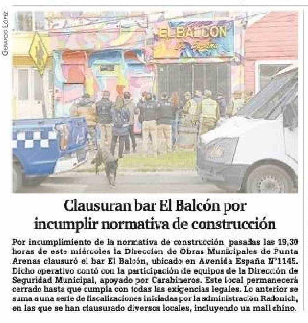 Clausuran bar El Balcón por incumplir normativa de construcción 15-01-2026 La Prensa Austral |