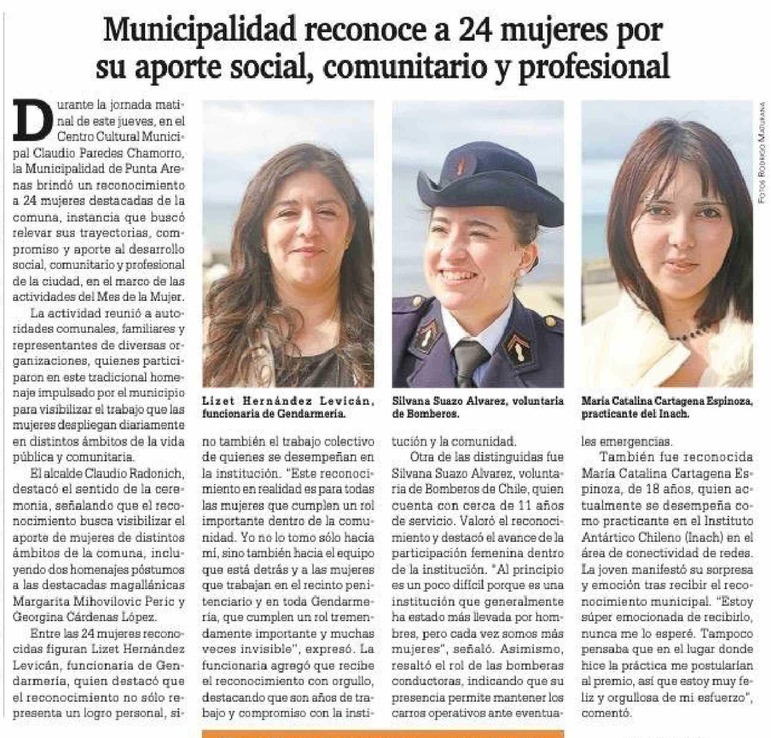 Municipalidad reconoce a 24 mujeres por su aporte social, comunitario y profesional 06-03-2026 La Prensa Austral |