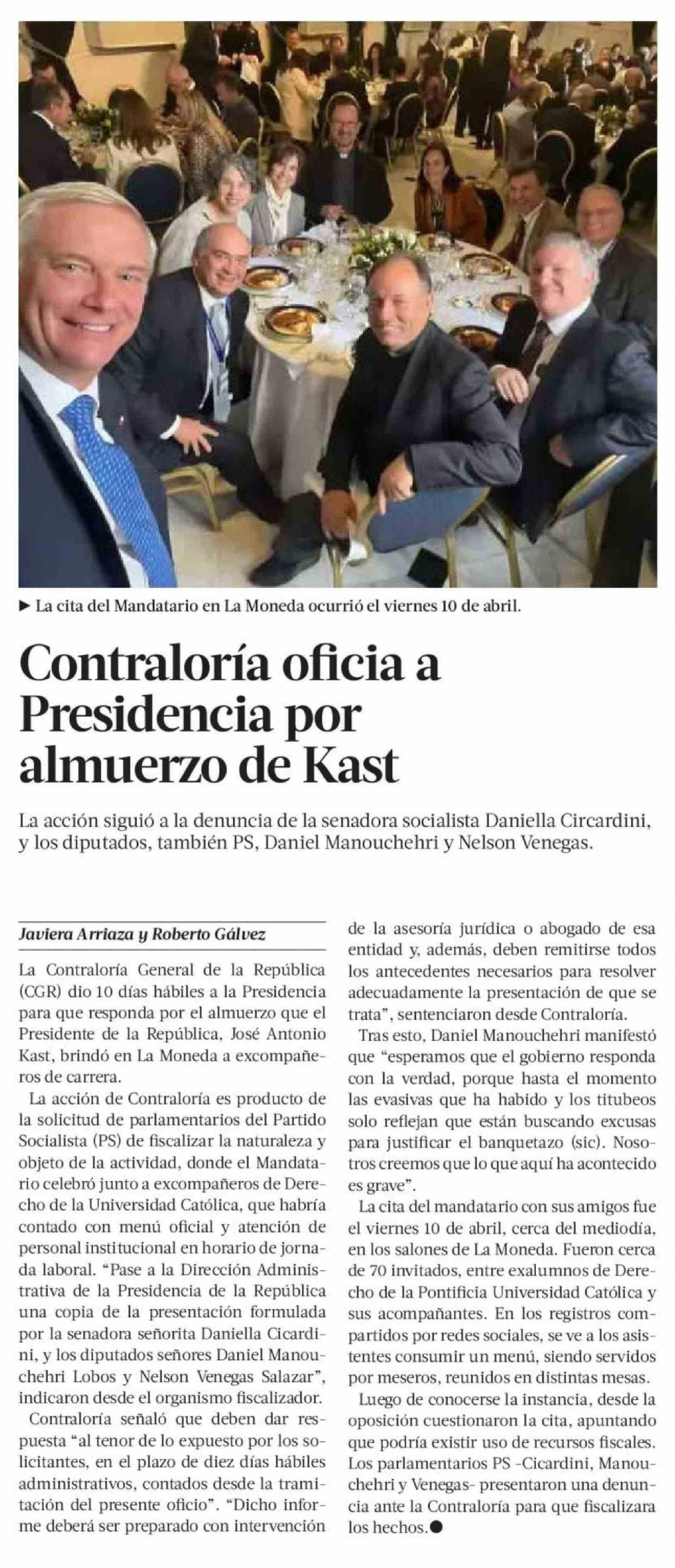 Contraloría oficia a Presidencia por almuerzo de Kast 15-04-2026 La Tercera |