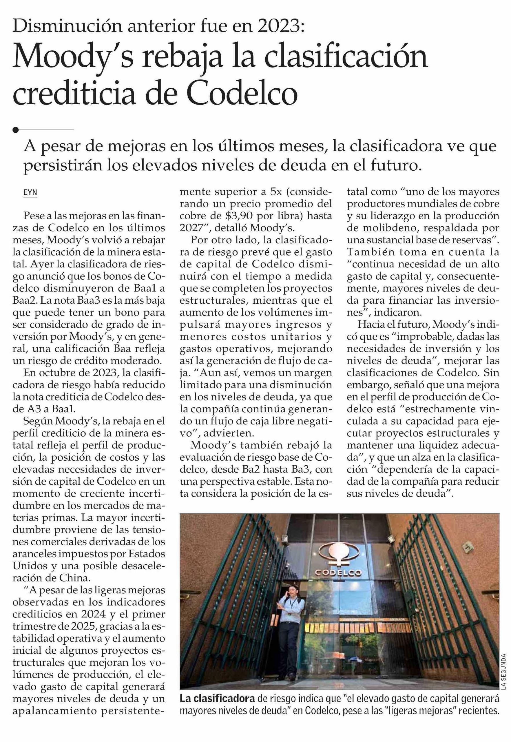 Moody's rebaja la clasificación crediticia de Codelco 20-05-2025 El Mercurio |