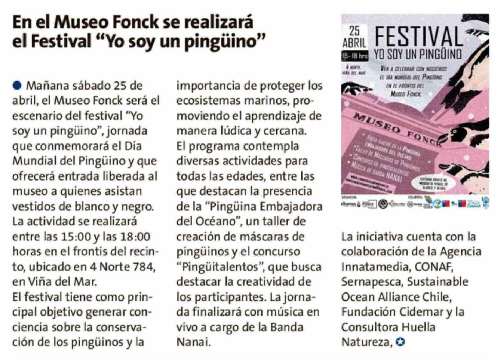 En el Museo Fonck se realizará el Festival "Yo soy un pingüino" 24-04-2026 La Estrella de Valparaíso |
