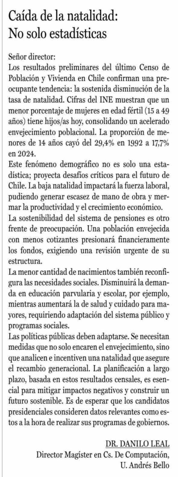 CARTAS: Caída de la natalidad: No solo estadísticas 14-05-2025 La Prensa de Curicó |