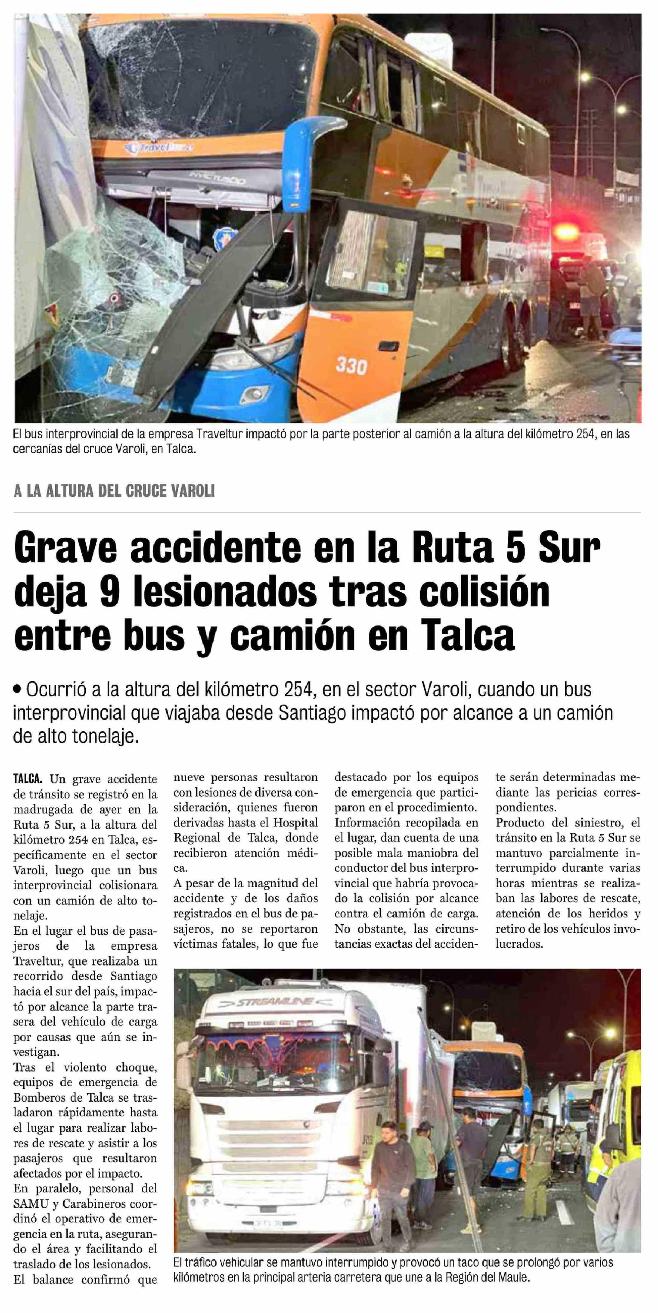 | Título: | Grave accidente en la Ruta 5 Sur deja 9 lesionados tras colisión entre bus y camión en Talca |