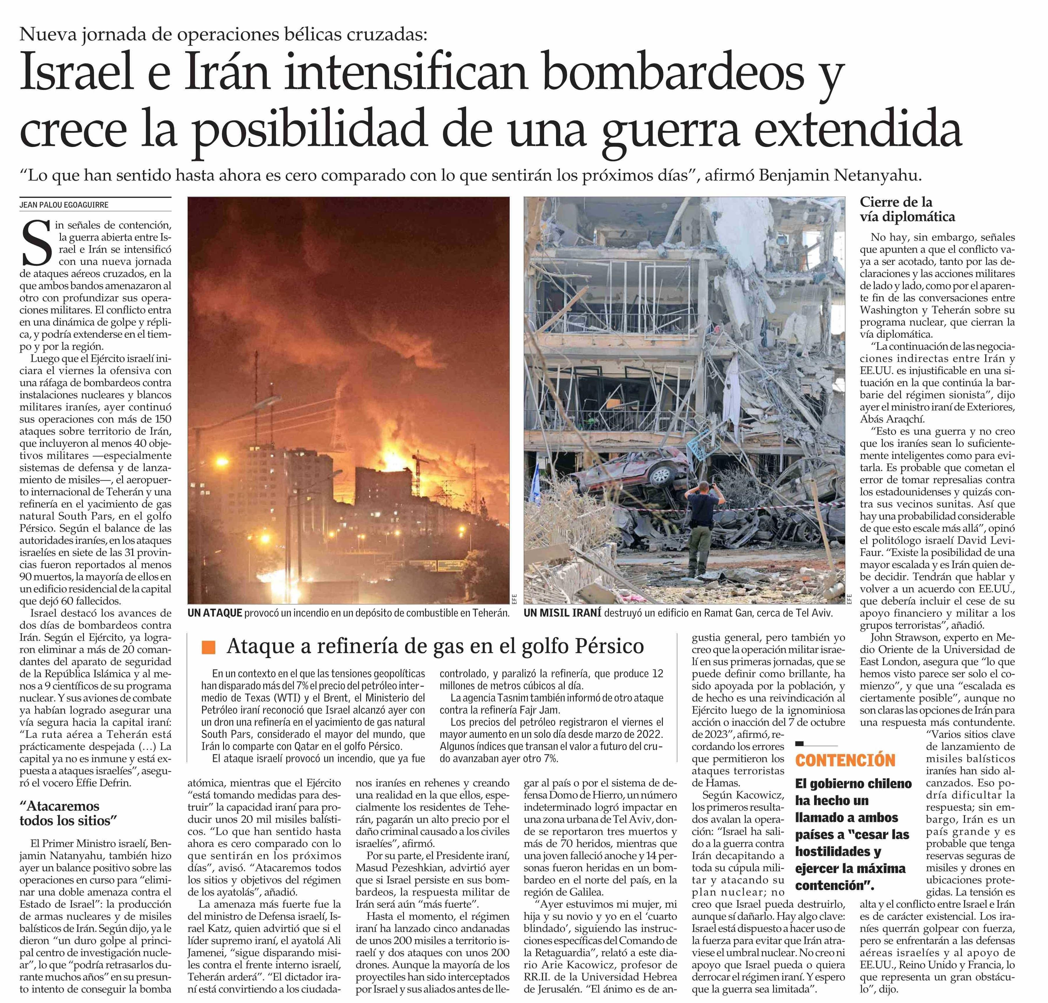Israel e Irán intensifican bombardeos y crece la posibilidad de una guerra extendida 15-06-2025 El Mercurio |