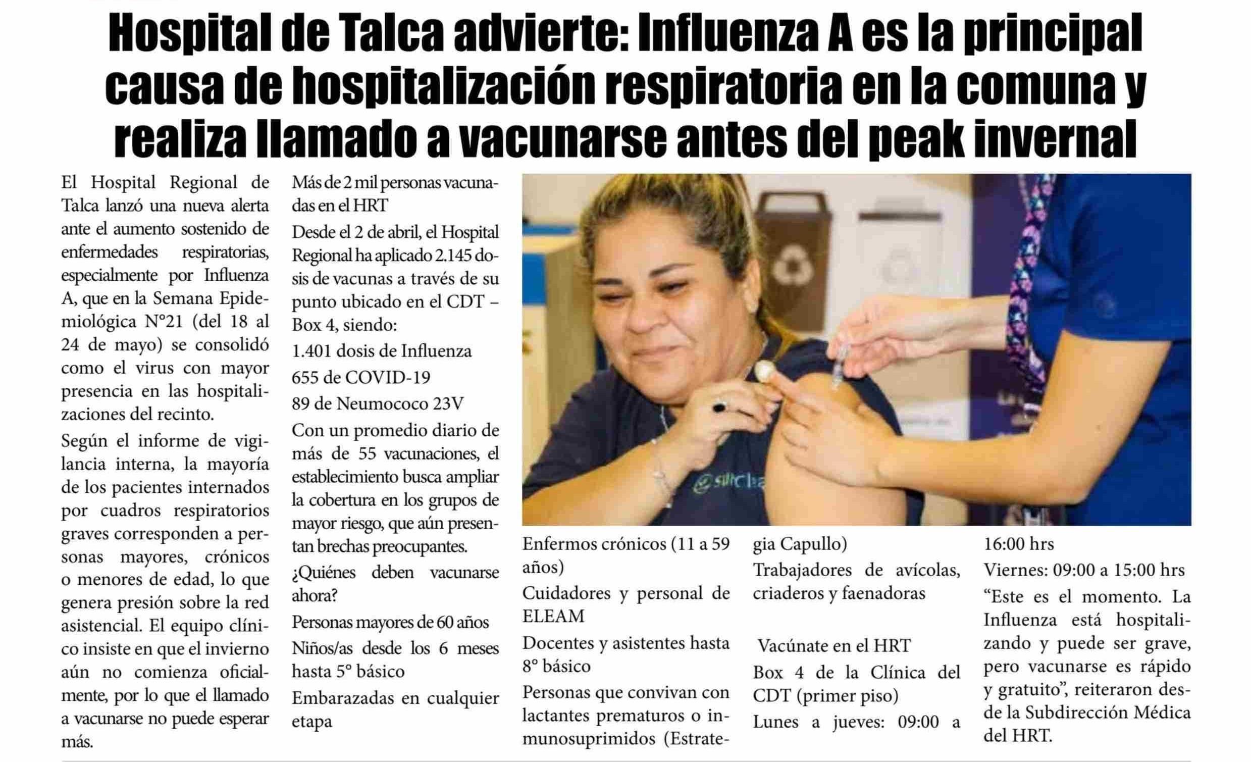 Hospital de Talca advierte: Influenza A es la principal causa de hospitalización respiratoria en la comuna y realiza llamado a vacunarse antes del peak invernal 31-05-2025 El Lector |