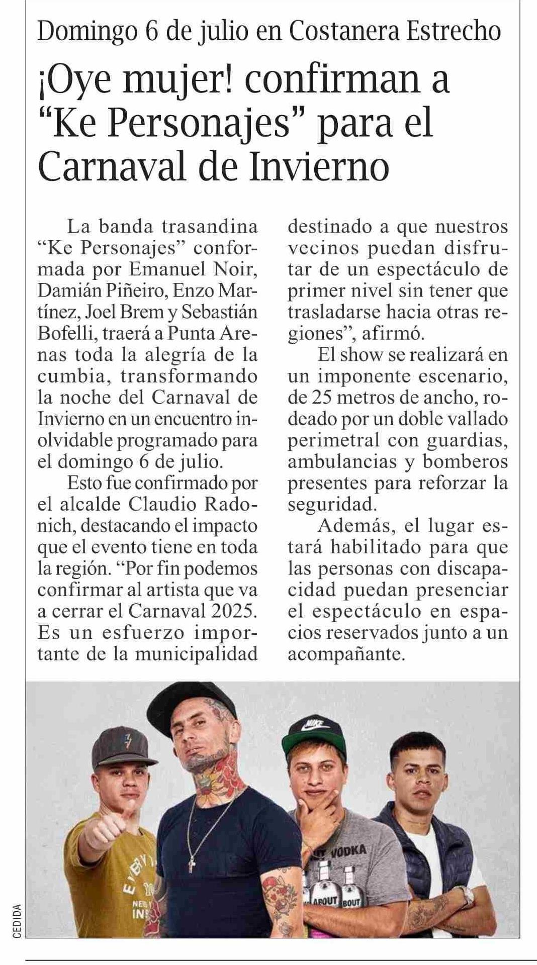 ¡Oye mujer! confirman a “Ke Personajes” para el Carnaval de Invierno 14-06-2025 El Pingüino |