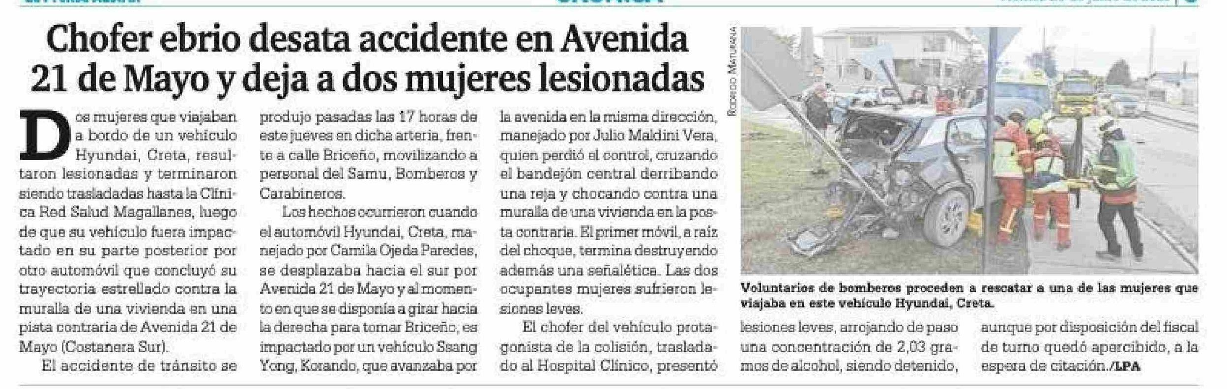 Chofer ebrio desata accidente en Avenida 21 de Mayo y deja a dos mujeres lesionadas 20-06-2025 La Prensa Austral |