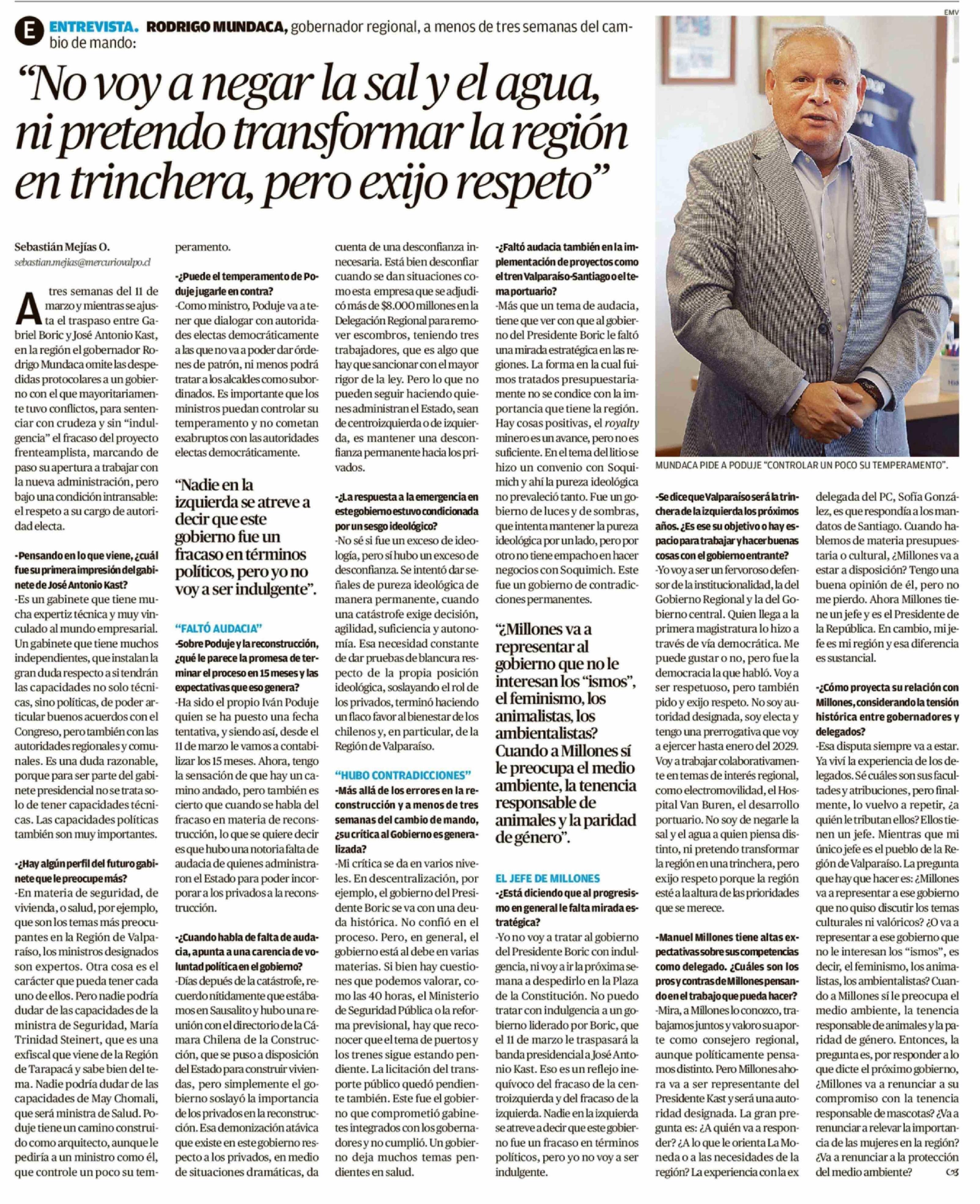 "No voy a negar la sal y el agua, ni pretendo transformar la región en trinchera, pero exijo respeto" 19-02-2026 El Mercurio de Valparaíso |
