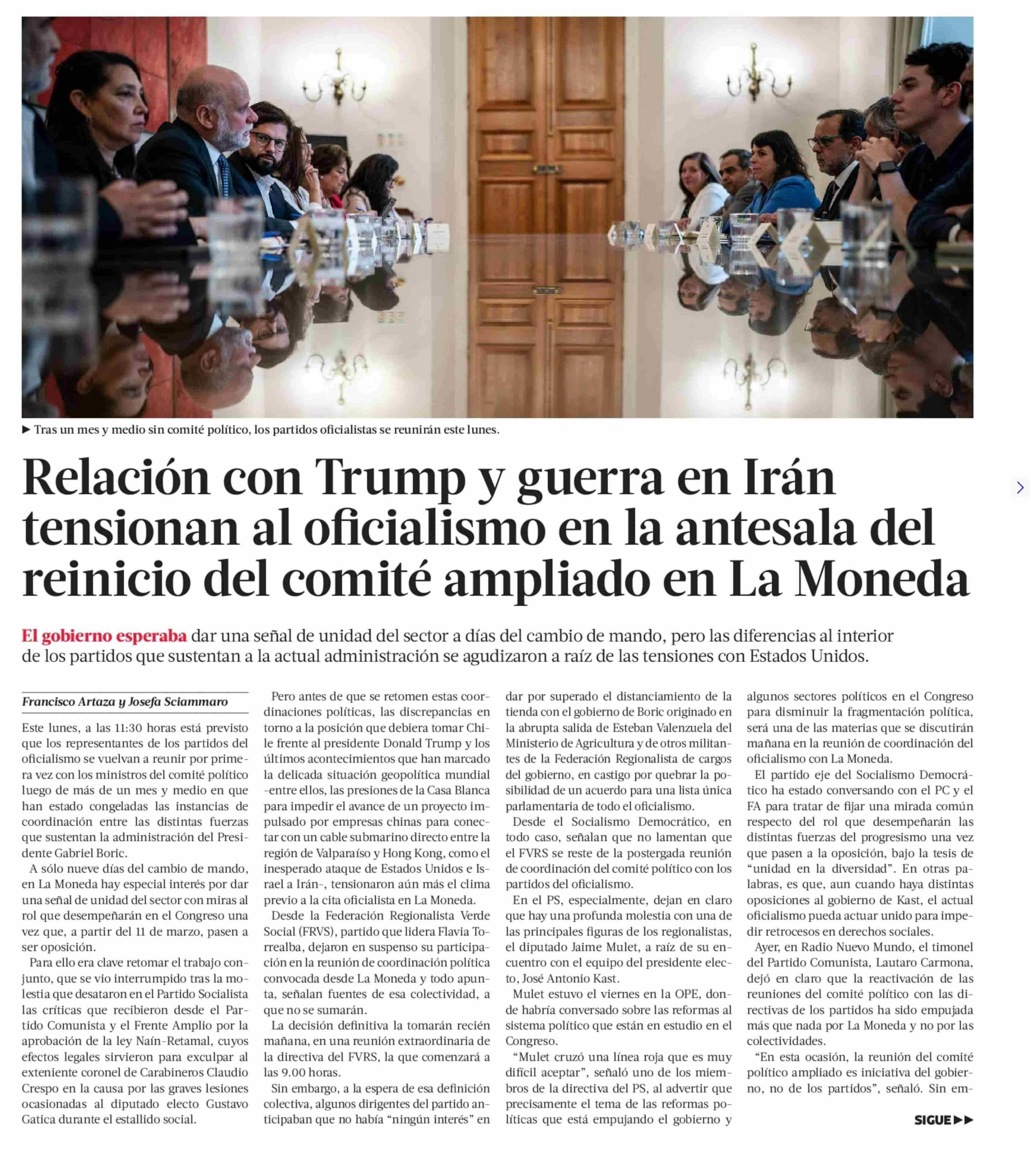 Relación con Trump y guerra en Irán tensionan al oficialismo en la antesala del reinicio del comité ampliado en La Moneda 02-03-2026 La Tercera |