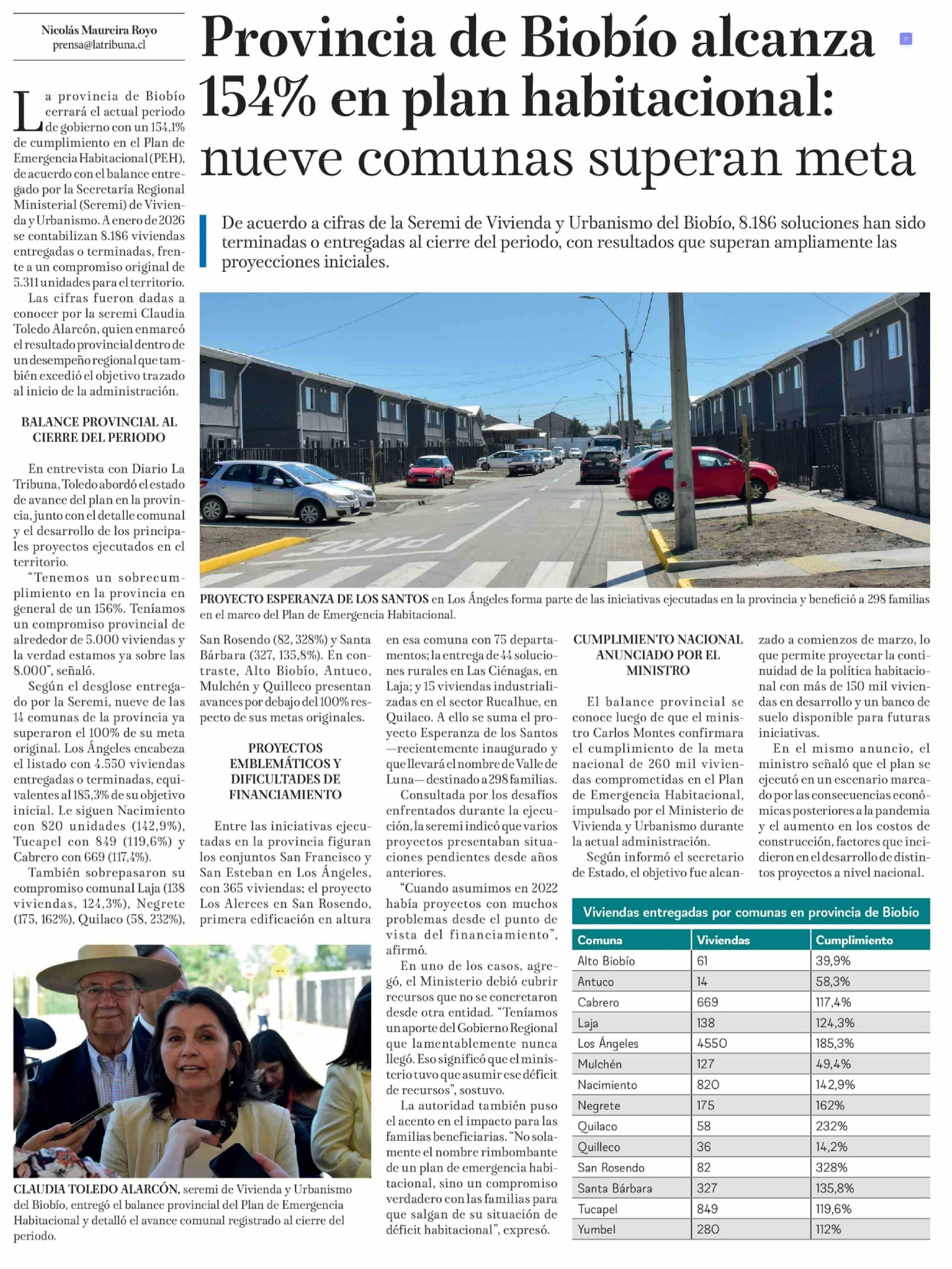 Provincia de Biobío alcanza 154% en plan habitacional: nueve comunas superan meta 03-03-2026 La Tribuna |