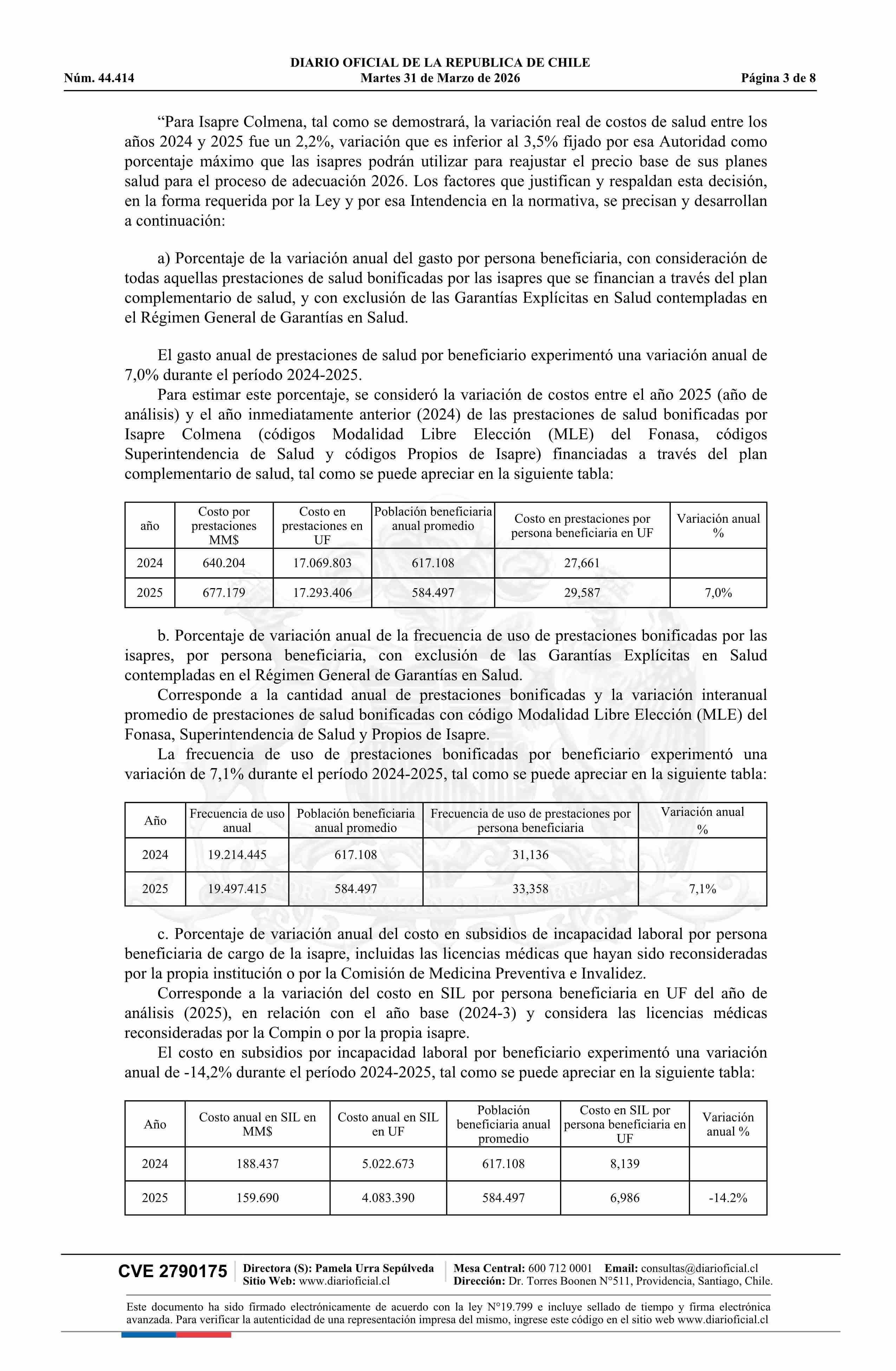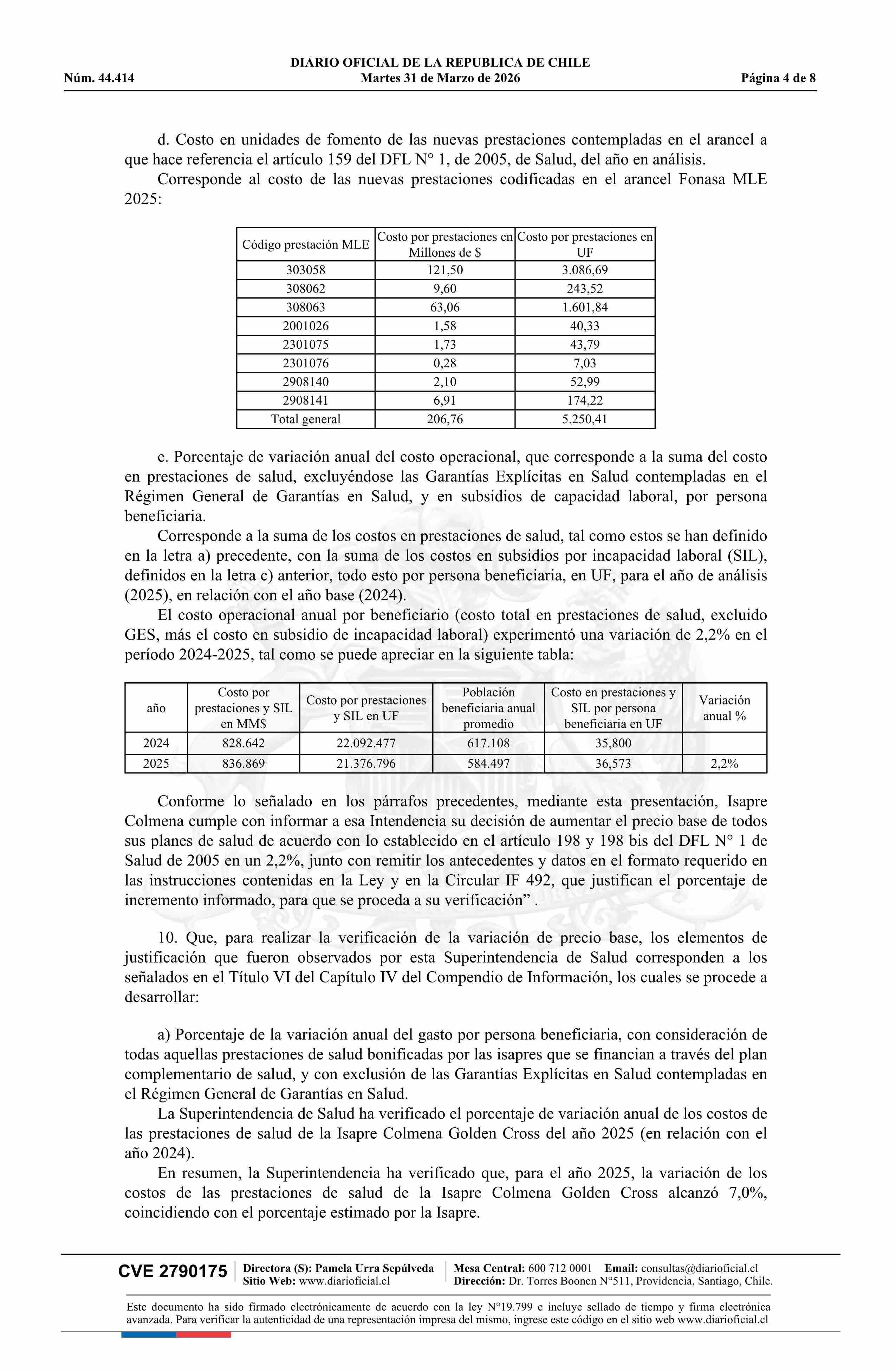 Resolución exenta número IF 3.124, de 2026.- Autoriza ajuste de los precios base de los planes de salud de la Isapre Colmena Golden Cross 31-03-2026 Diario Oficial Edición Electrónica |