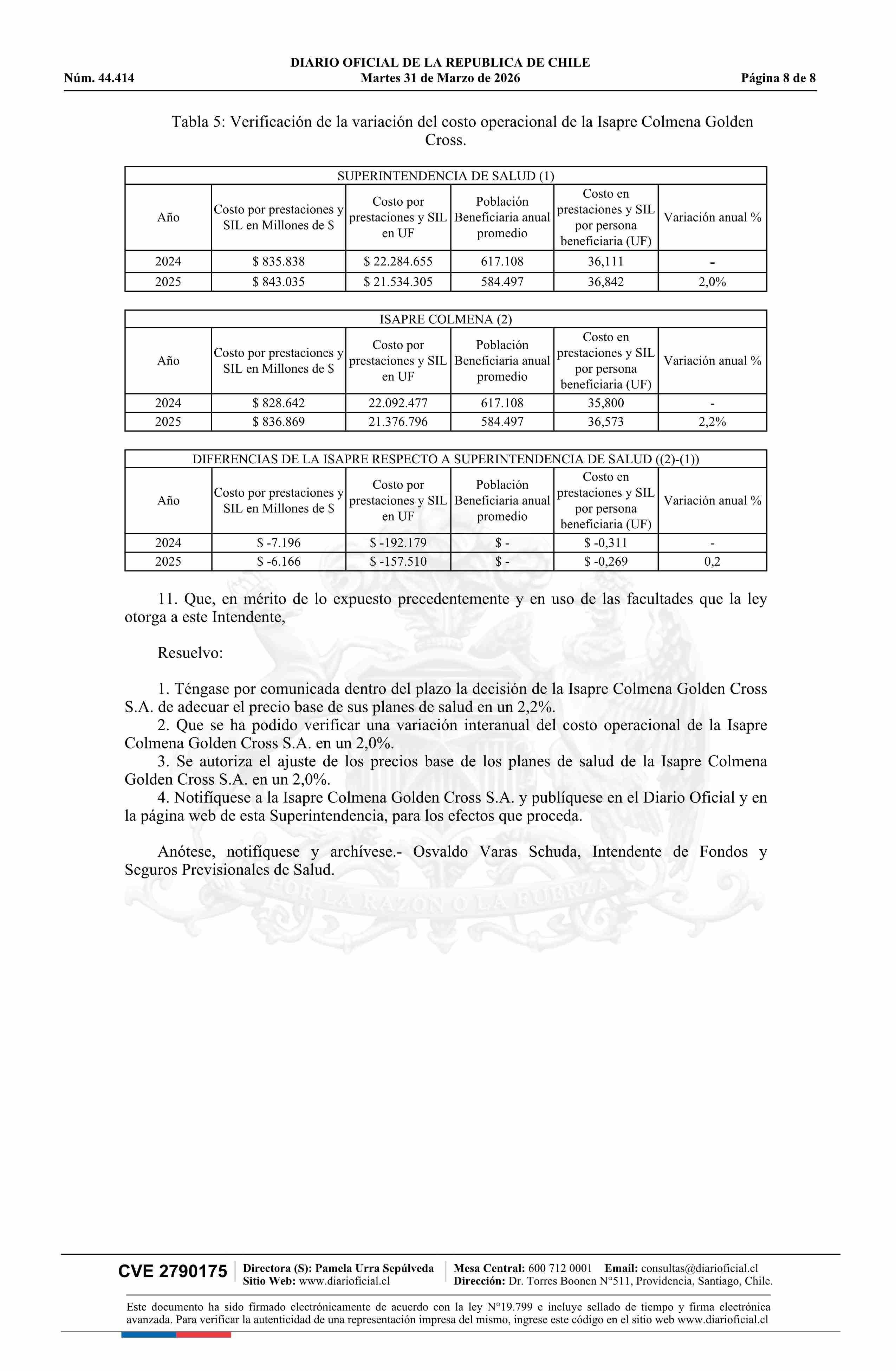 | Título: | Resolución exenta número IF 3.124, de 2026.- Autoriza ajuste de los precios base de los planes de salud de la Isapre Colmena Golden Cross |