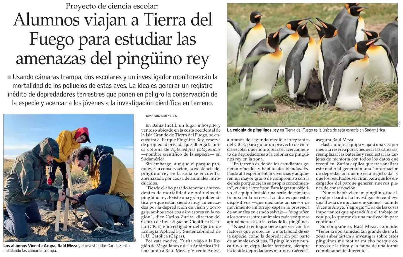 Alumnos viajan a Tierra del Fuego para estudiar las amenazas del pingüino rey 16-03-2020 El Mercurio |
