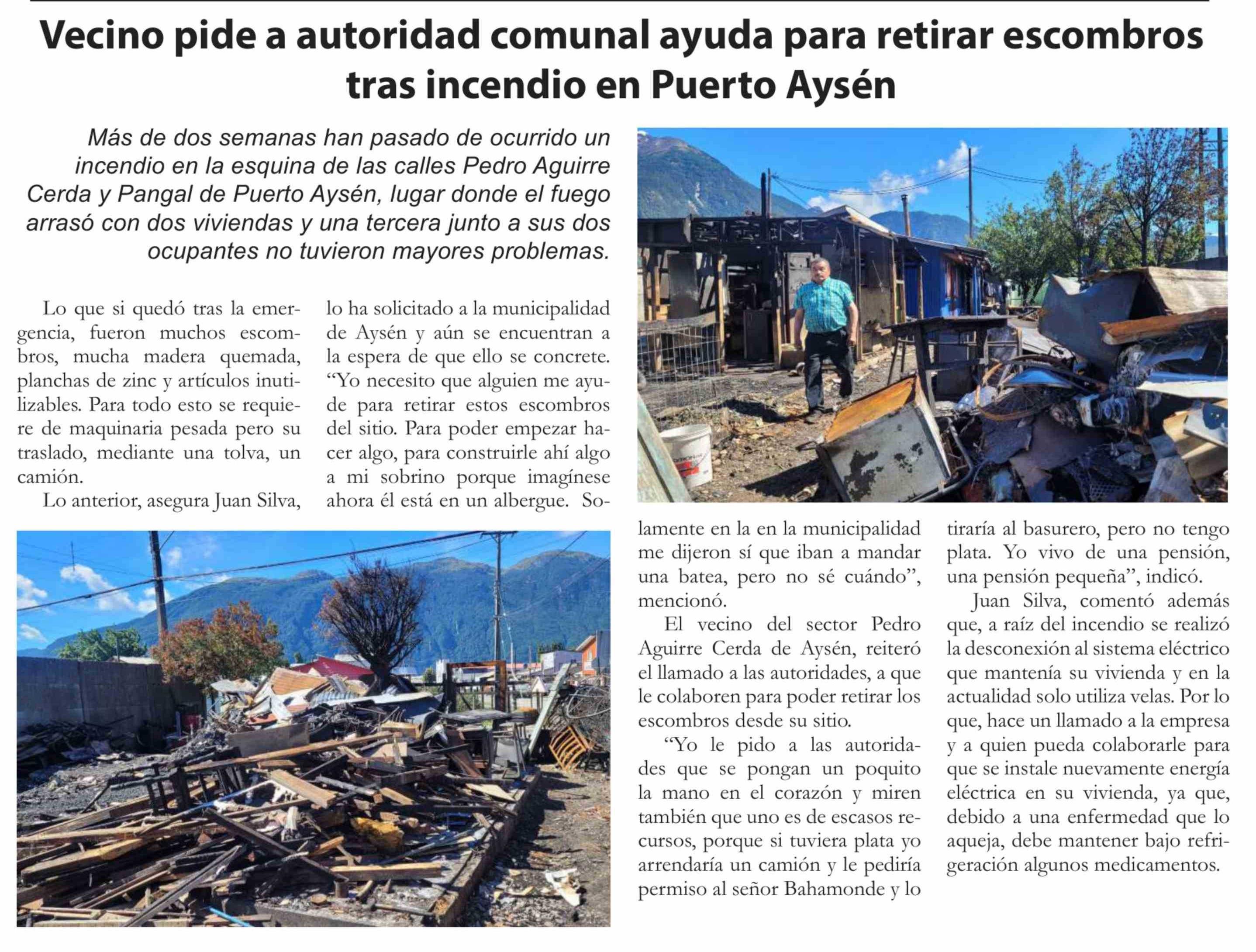 | Título: | Vecino pide a autoridad comunal ayuda para retirar escombros tras incendio en Puerto Aysén |