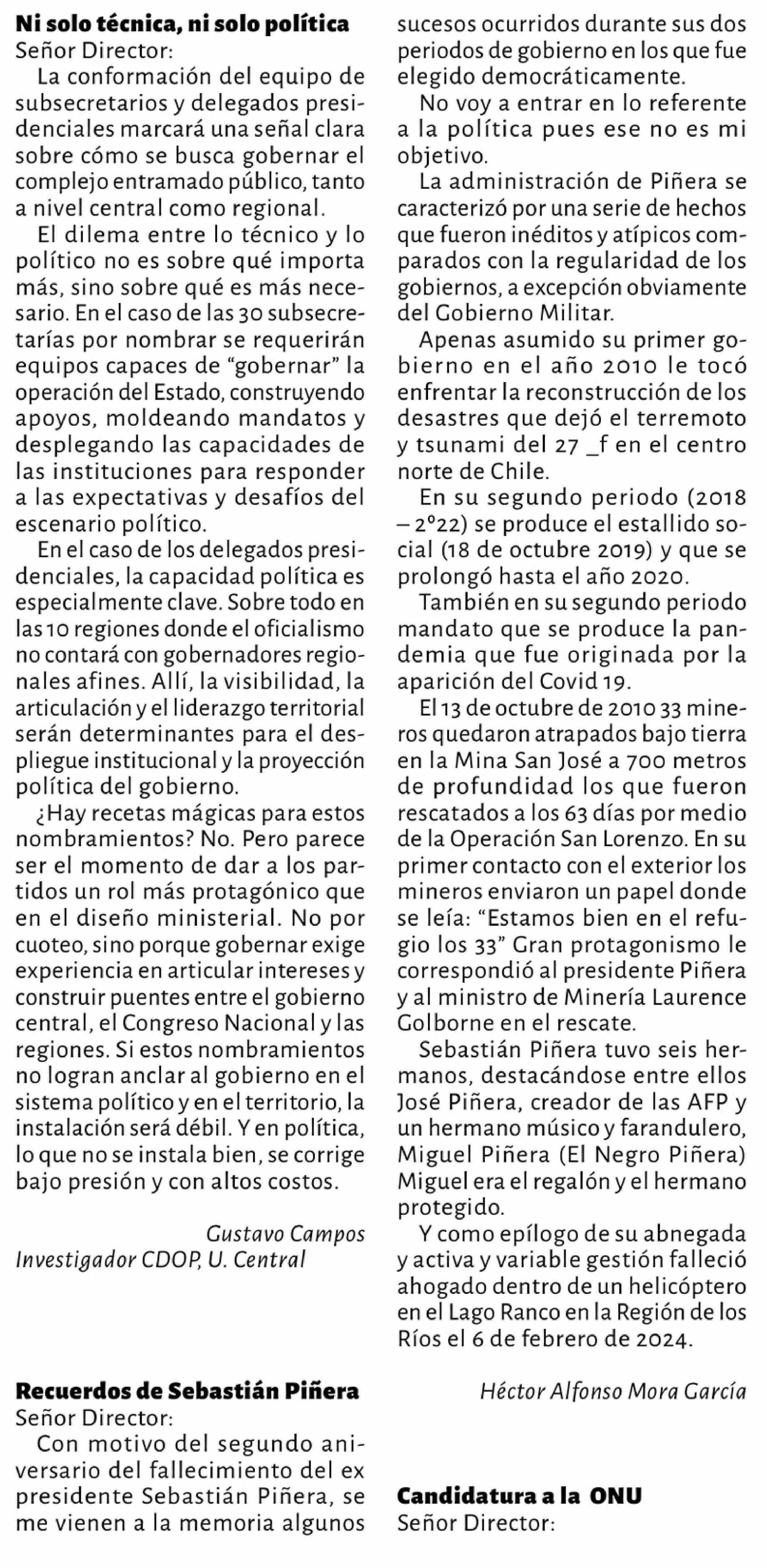 | Título: | Cartas: Recuerdos de Sebastian Piñera Señor Director: Con motivo del segundo aniversario del fallecimiento del ex presidente Sebastián Piñera, se me vienen a la memoria algunos |