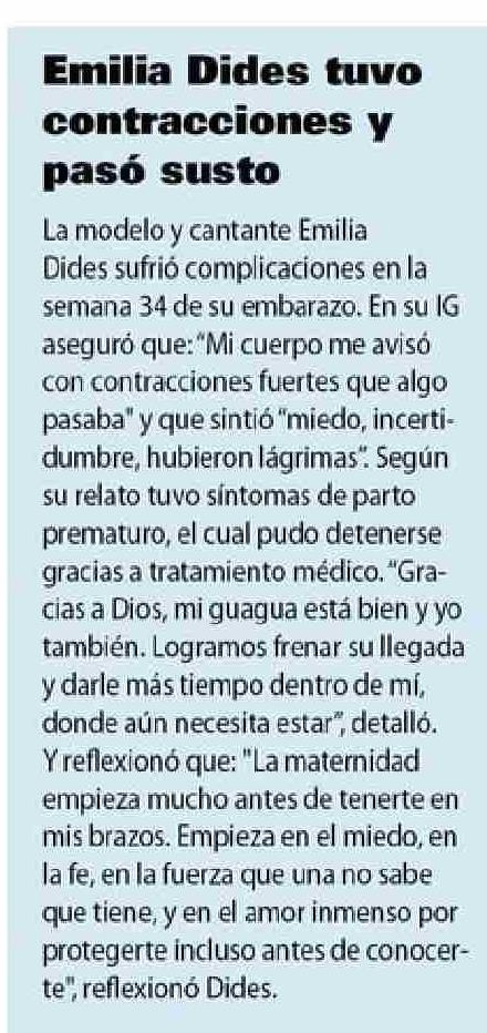 | Título: | Emilia Dides tuvo contracciones y pasó susto |