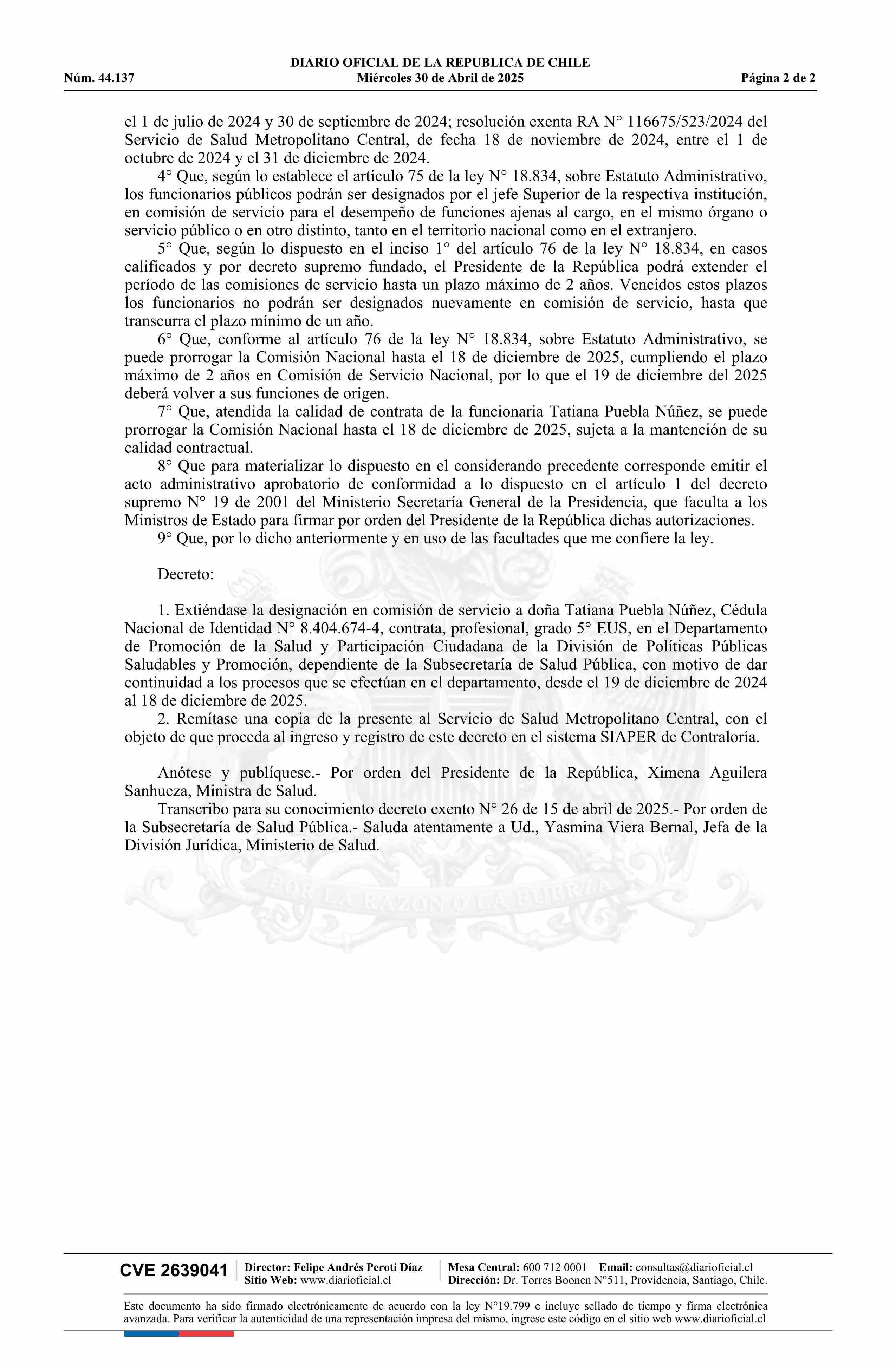 Título: Decreto exento número 26, de 2025.- Extiende la designación en comisión de servicio a doña Tatiana Puebla Núñez en el Departamento de Promoción de la Salud y Participación Ciudadana de la División de Políticas Públicas Saludables y Promoción