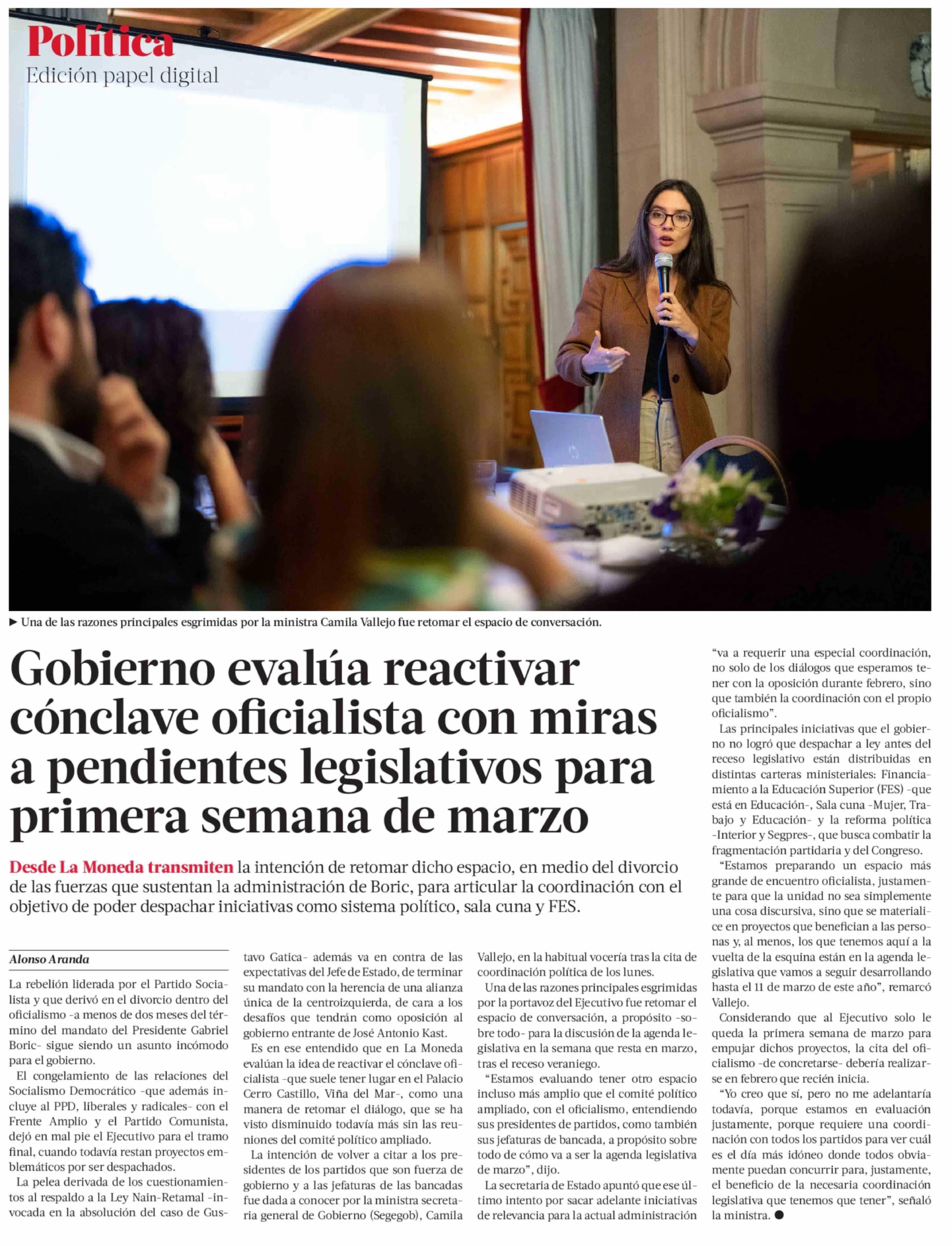 Título: Gobierno evalúa reactivar cónclave oficialista con miras a pendientes legislativos para primera semana de marzo