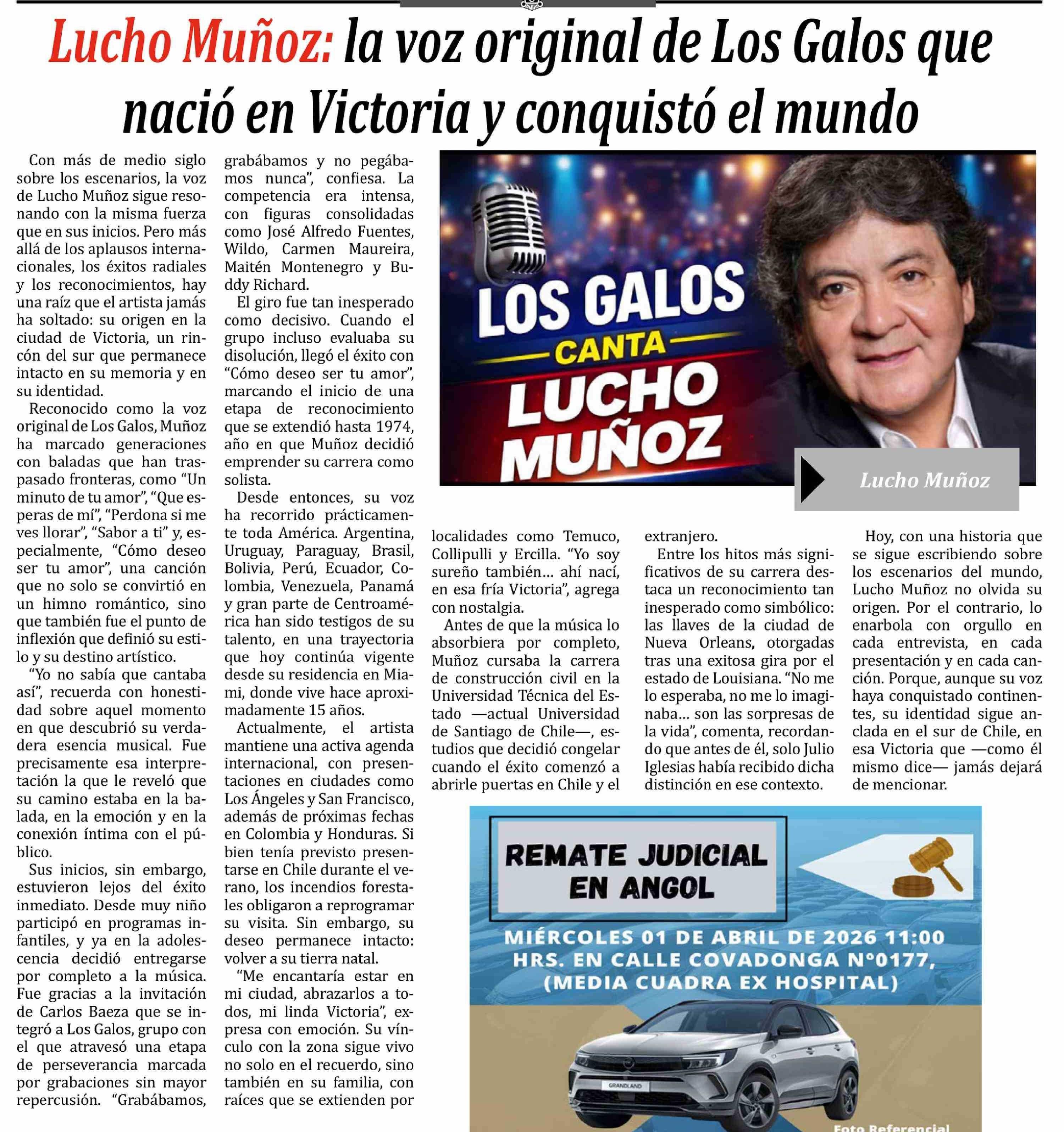 Título: Lucho Muñoz: la voz original de Los Galos que nació en Victoria y conquistó el mundo