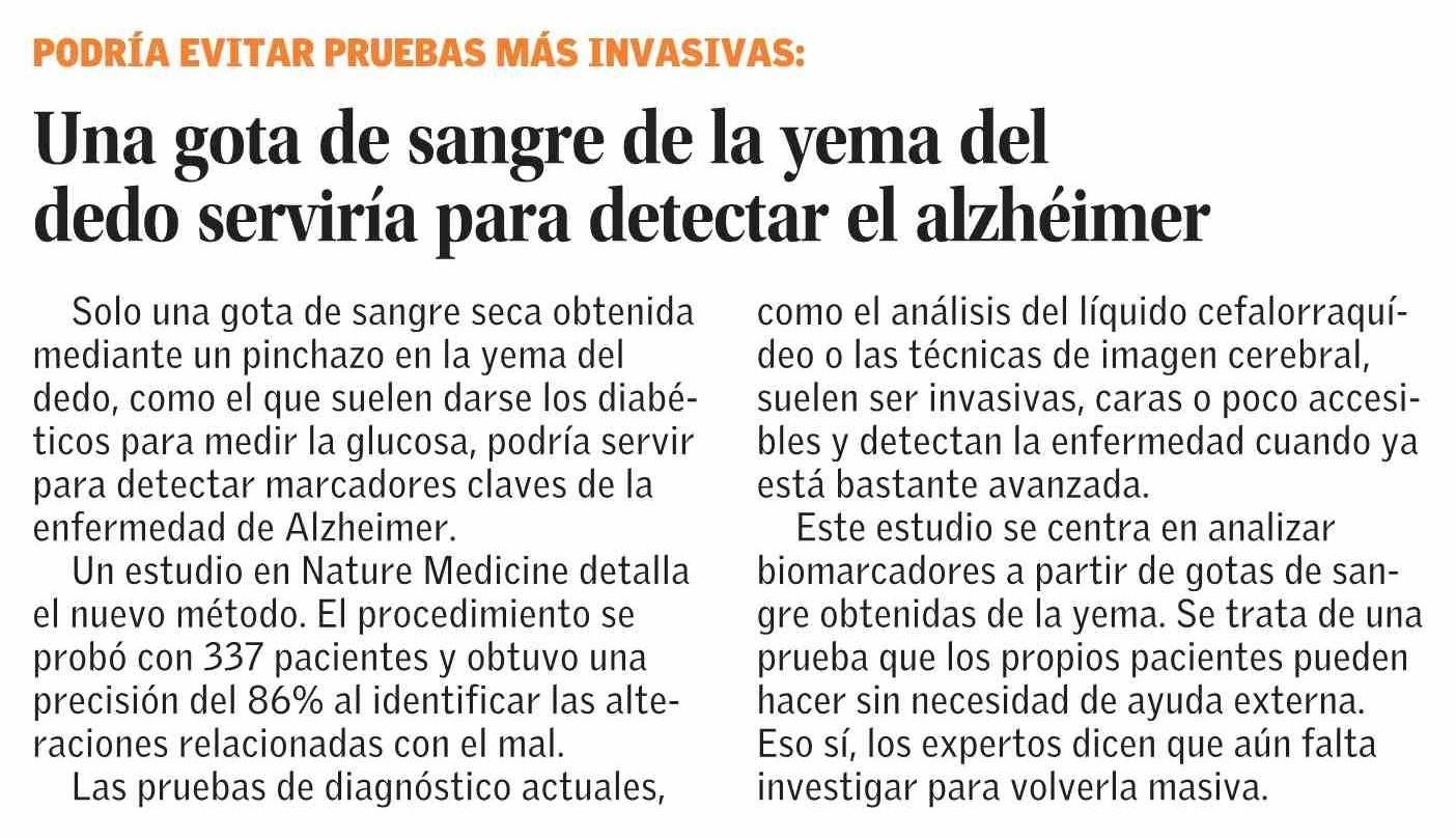 | Título: | Una gota de sangre de la yema del dedo serviría para detectar el alzhéimer |