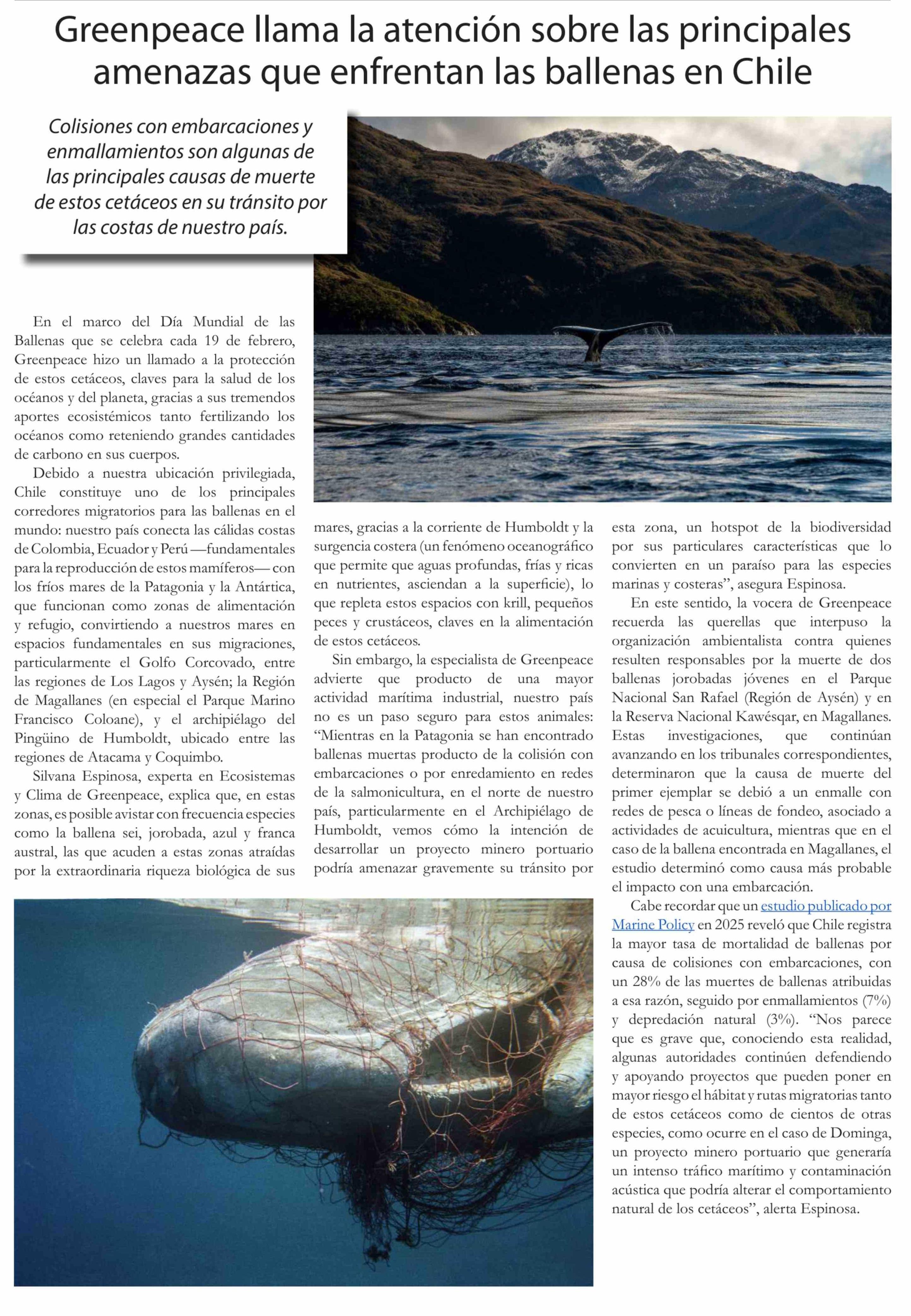 Greenpeace llama la atención sobre las principales amenazas que enfrentan las ballenas en Chile 17-02-2026 El Divisadero |