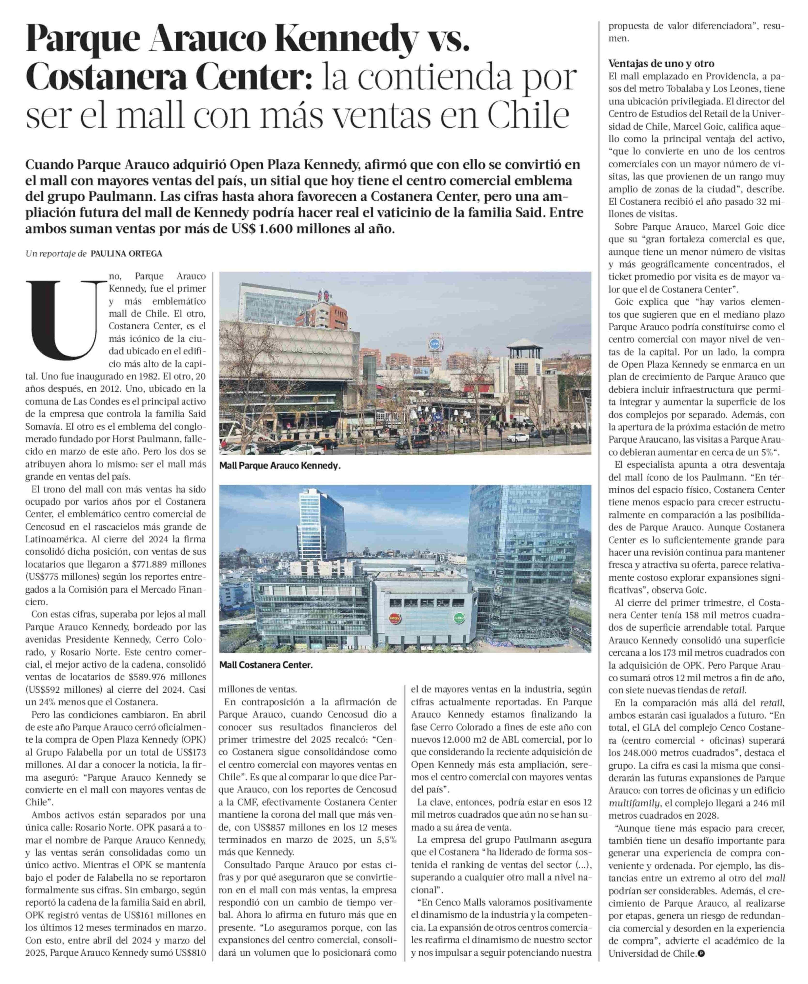 Parque Arauco Kennedy vs. Costanera Center: la contienda por ser el mall con más ventas en Chile 24-05-2025 La Tercera |