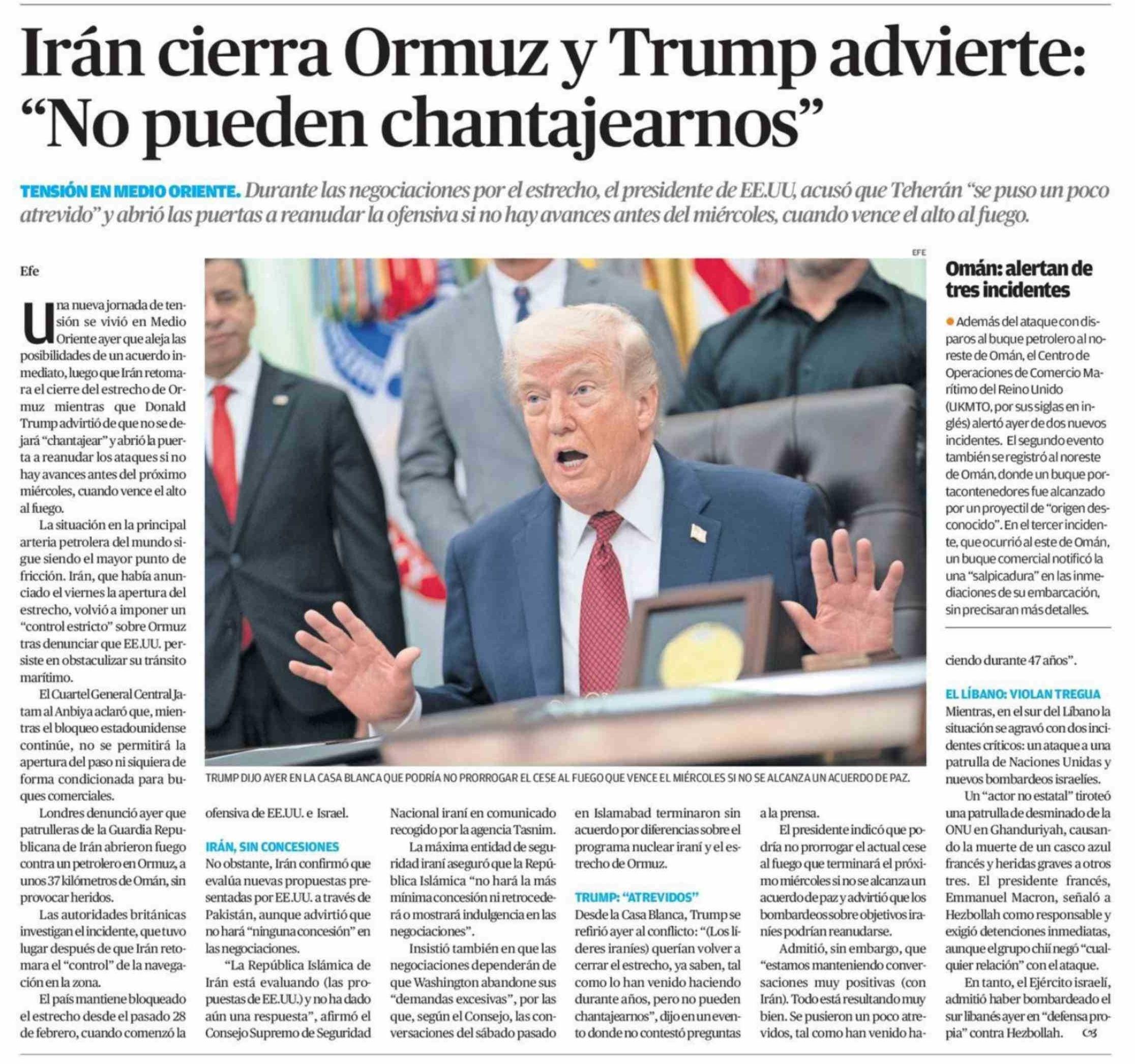 Irán cierra Ormuz y Trump advierte: "No pueden chantajearnos" 19-04-2026 El Mercurio de Antofagasta |