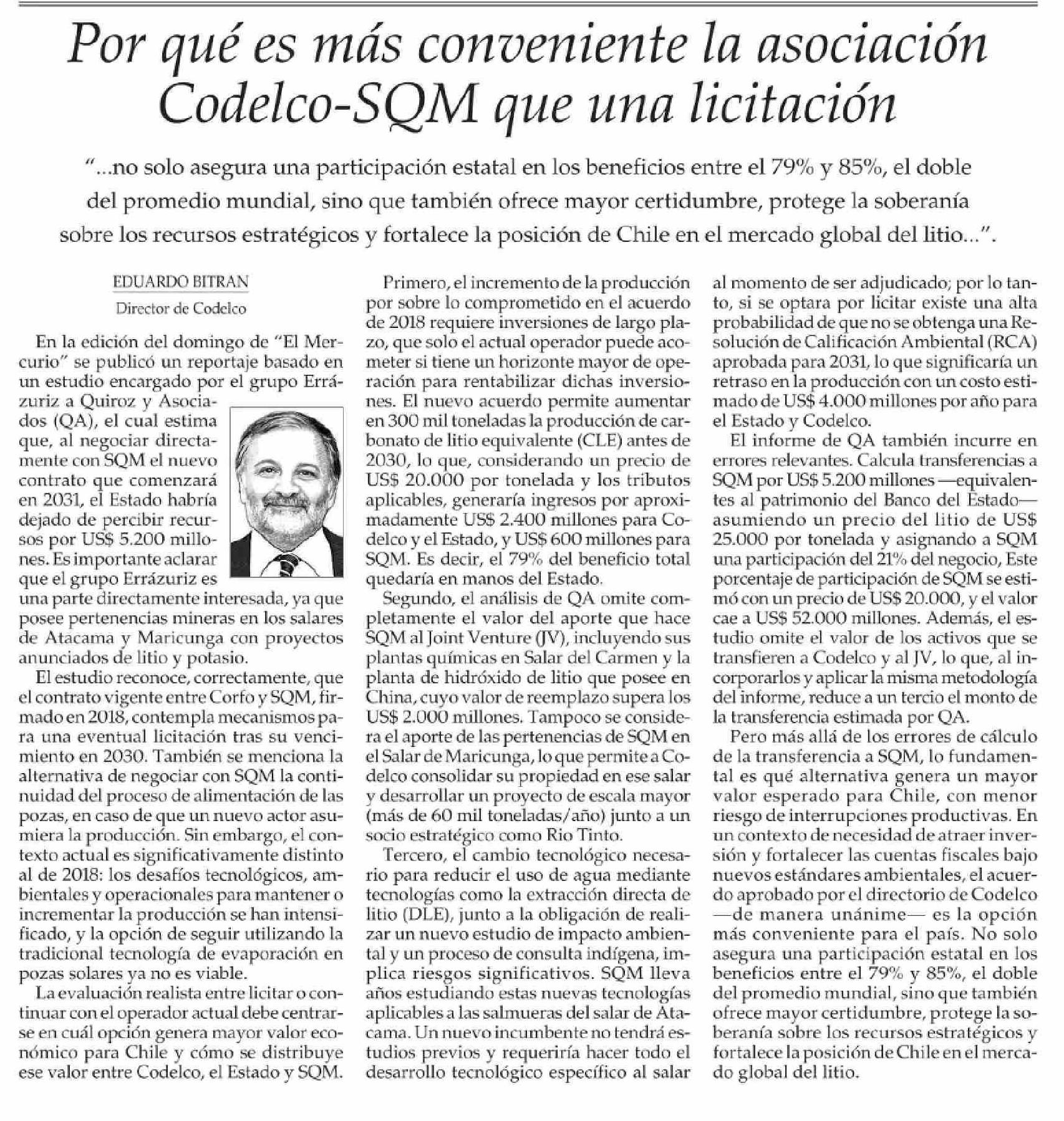 Título: COLUMNAS DE OPINIÓN: Por qué es más conveniente la asociación Codelco-SQM que una licitación