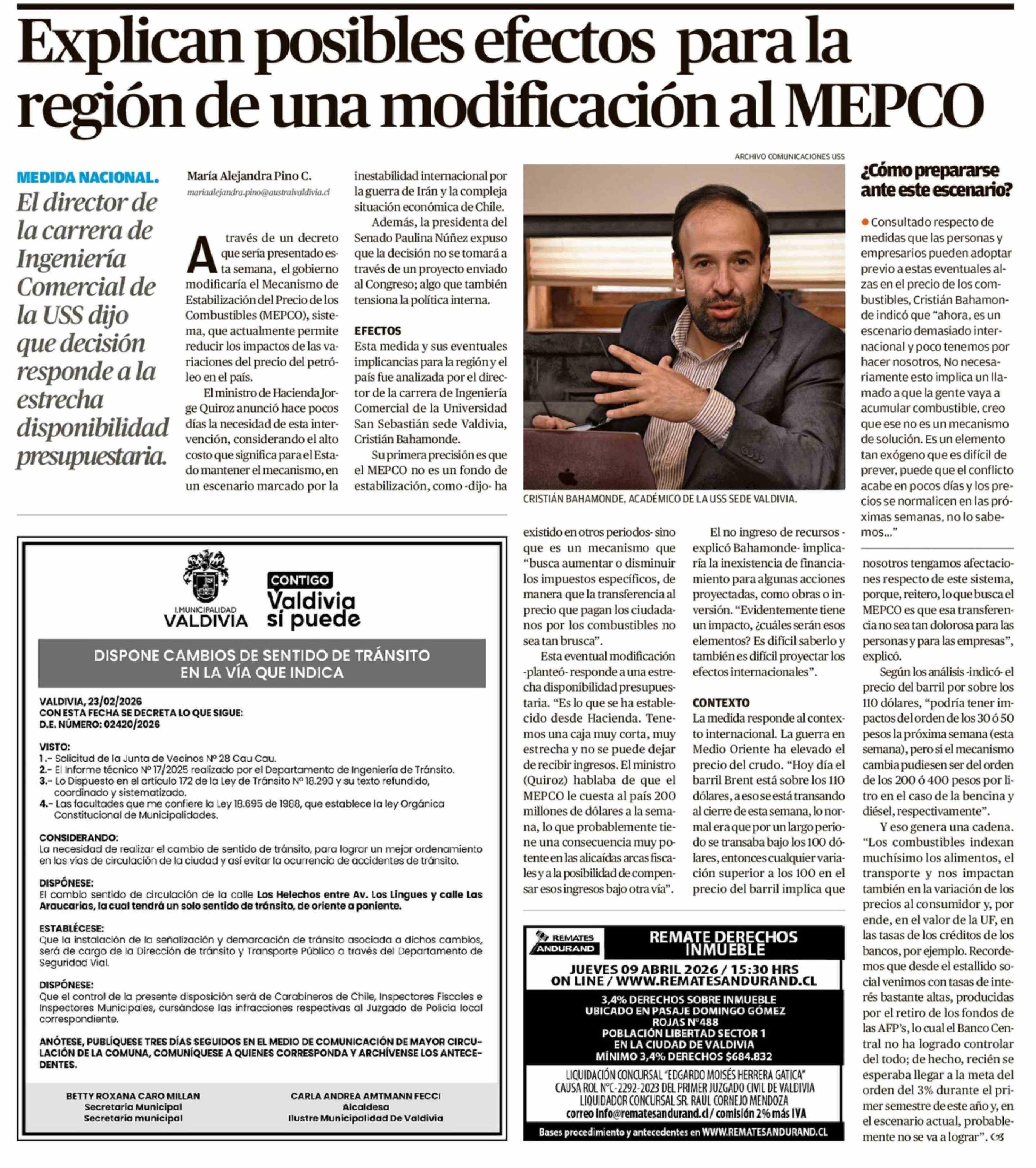 Explican posibles efectos para la región de una modificación al MEPCO 23-03-2026 Diario Austral Región de Los Ríos |