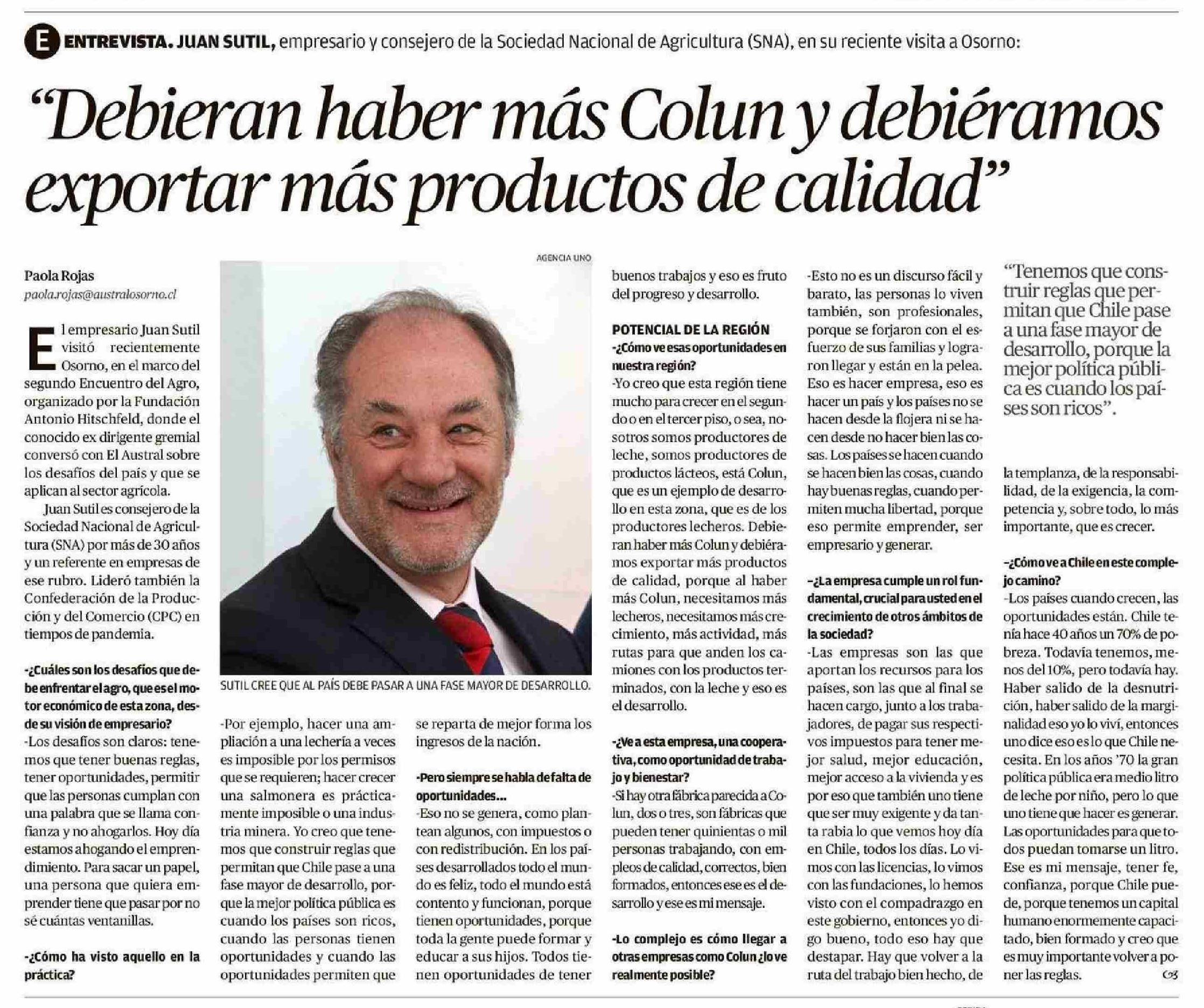 "Debieran haber más Colun y debiéramos exportar más productos de calidad" 18-06-2025 El Austral de Osorno |