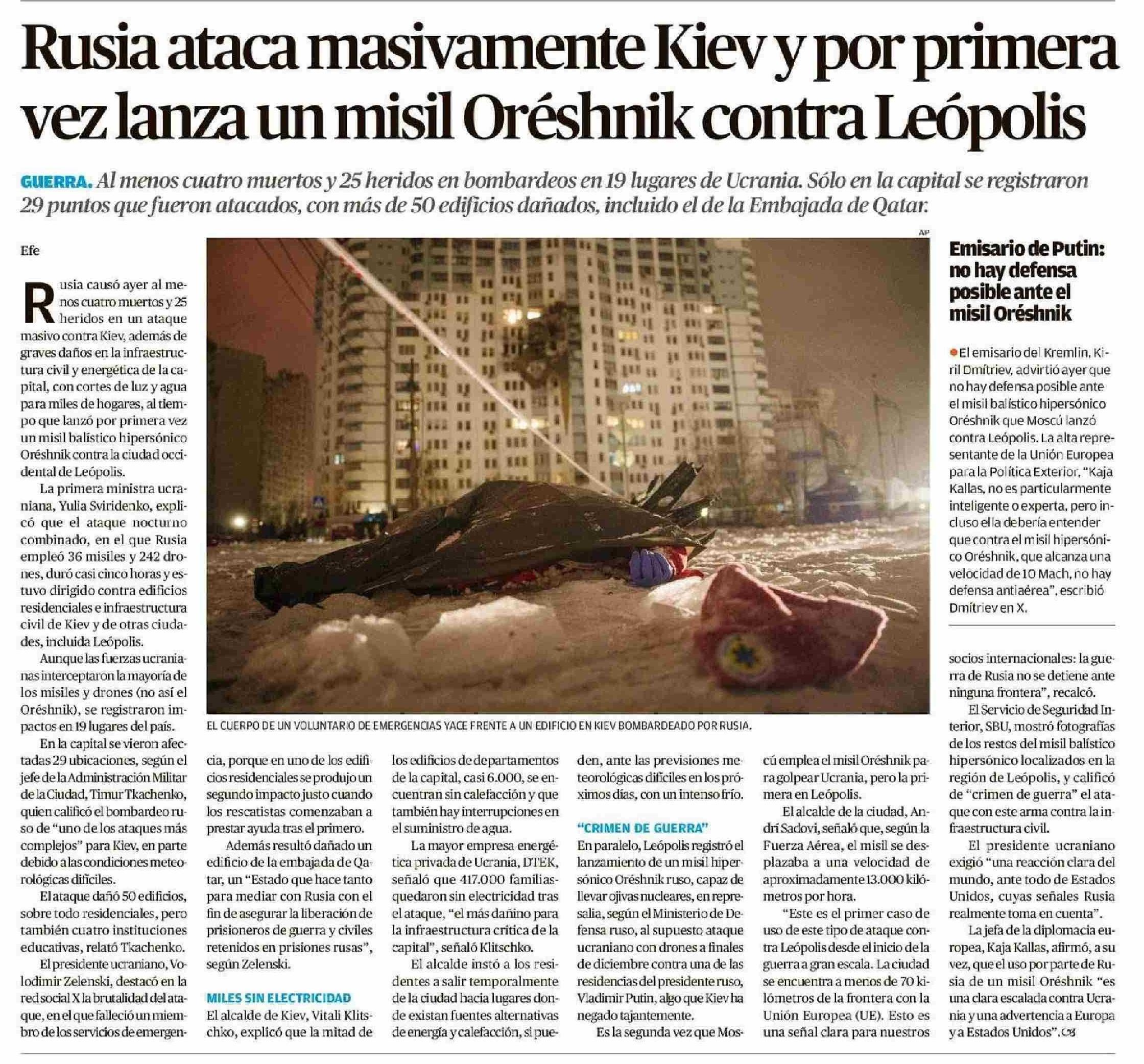 Título: Rusia ataca masivamente Kiev y por primera vez lanza un misil Oréshnik contra Leópolis