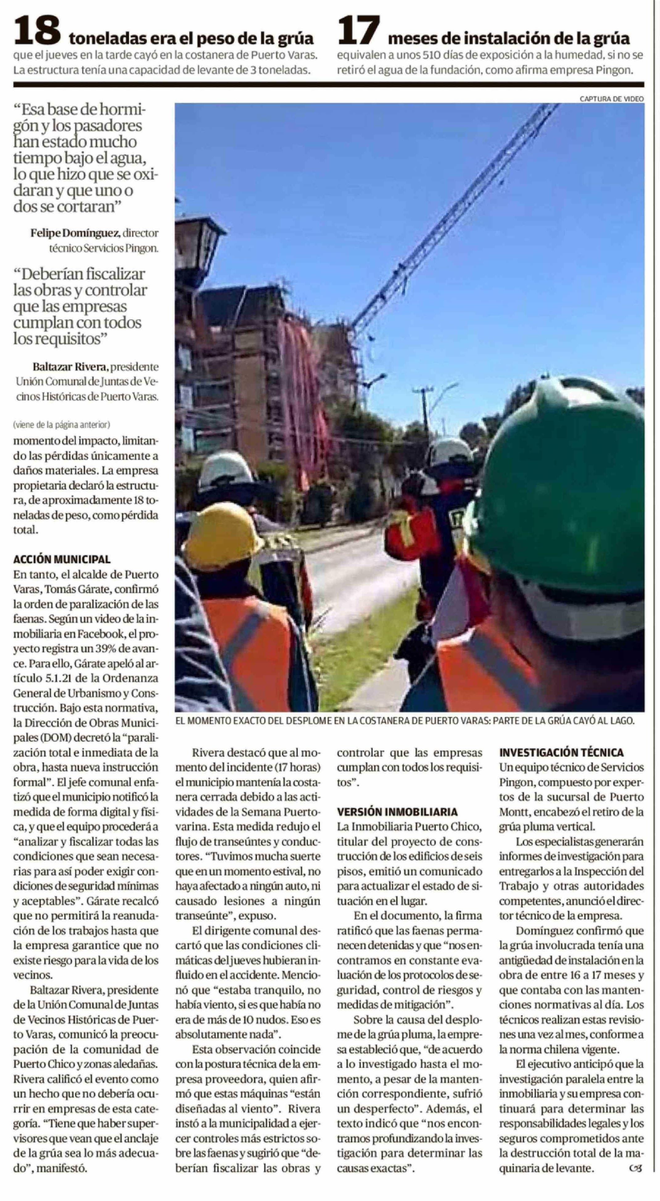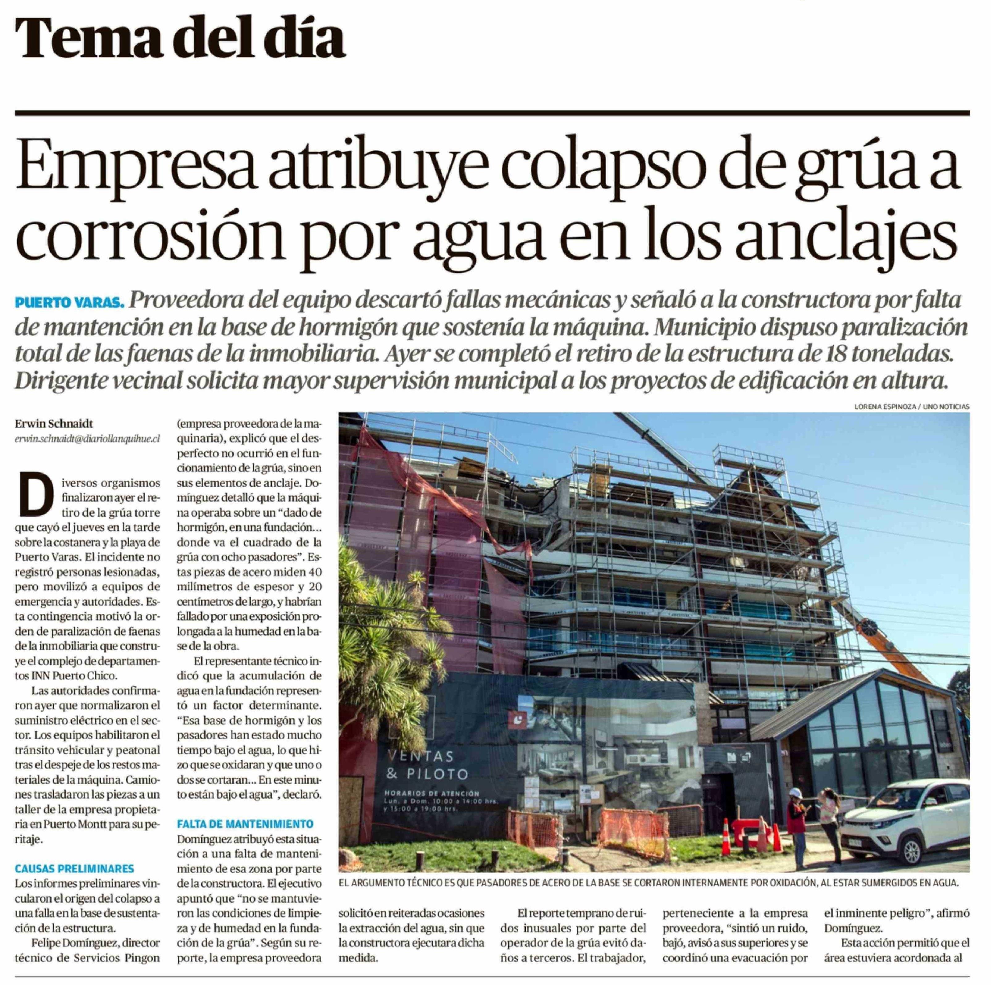 Empresa atribuye colapso de grúa a corrosión por agua en los anclajes 21-02-2026 El Llanquihue |