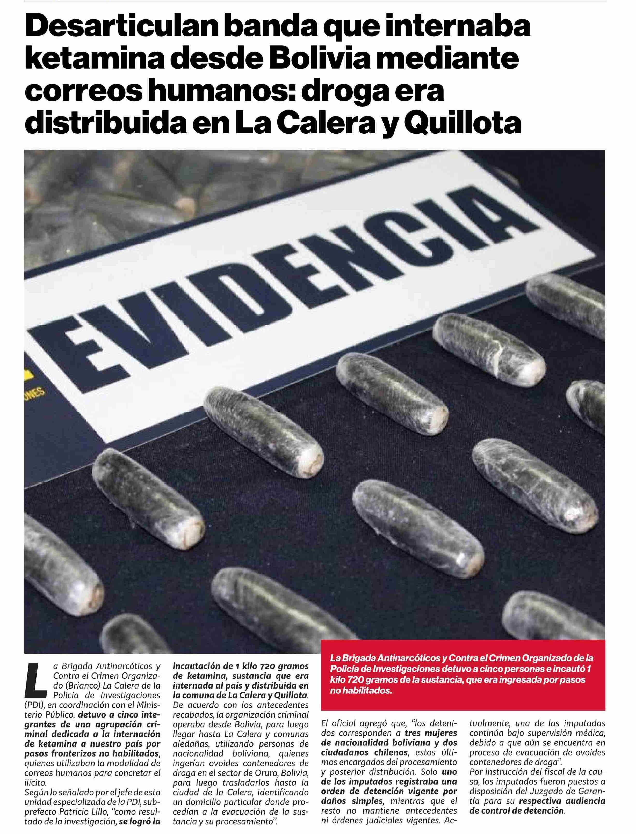 Título: Desarticulan banda que internaba ketamina desde Bolivia mediante correos humanos: droga era distribuida en La Calera y Quillota