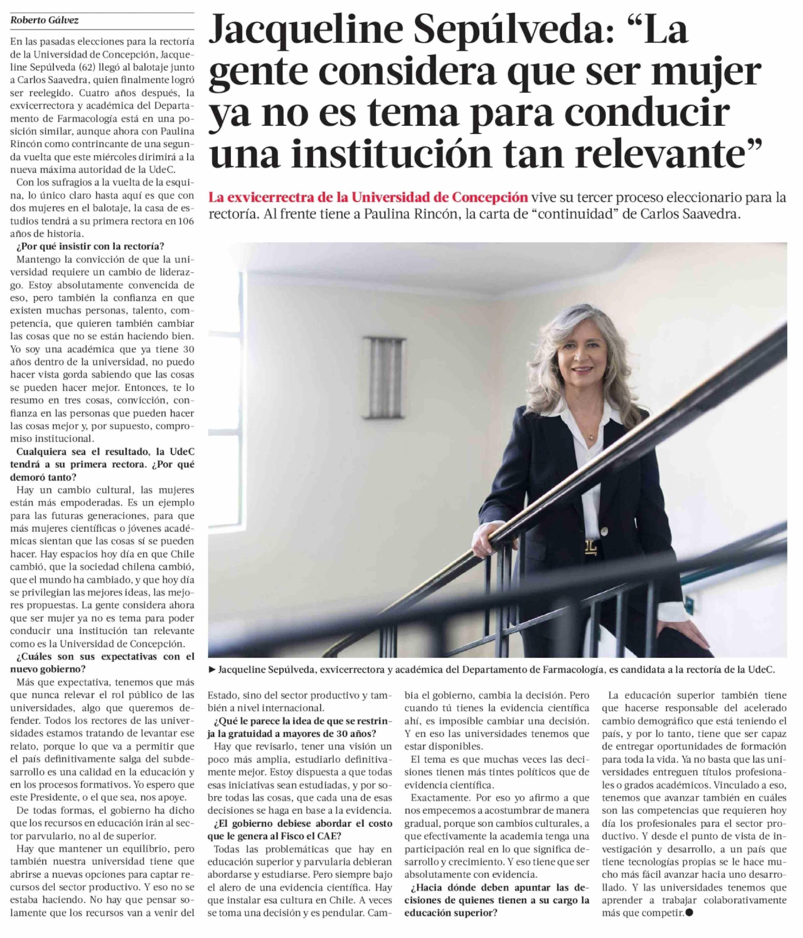 | Título: | Jacqueline Sepúlveda: "La gente considera que ser mujer ya no es tema para conducir una institución tan relevante" |