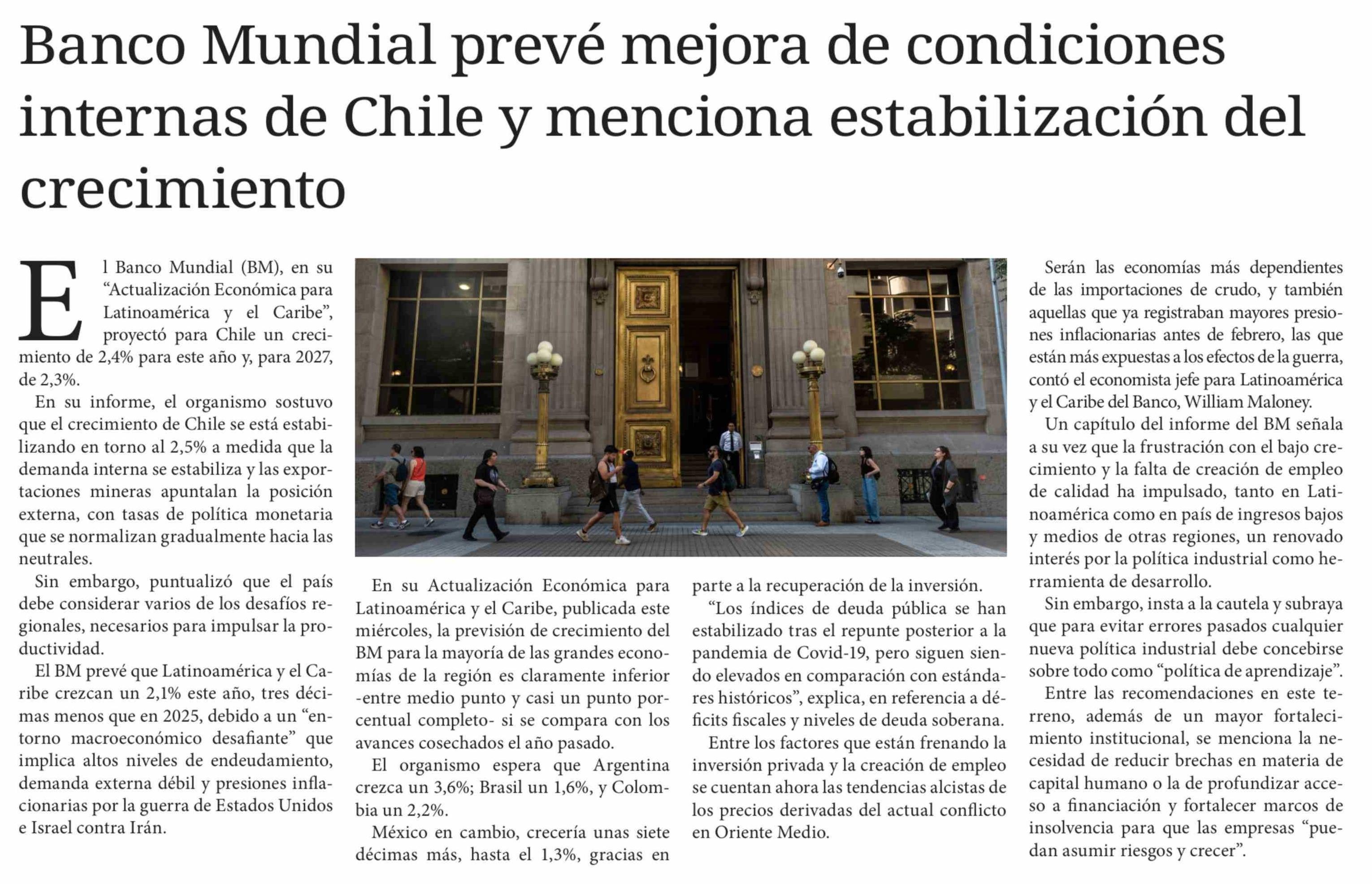 Título: Banco Mundial prevé mejora de condiciones internas de Chile y menciona estabilización del crecimiento