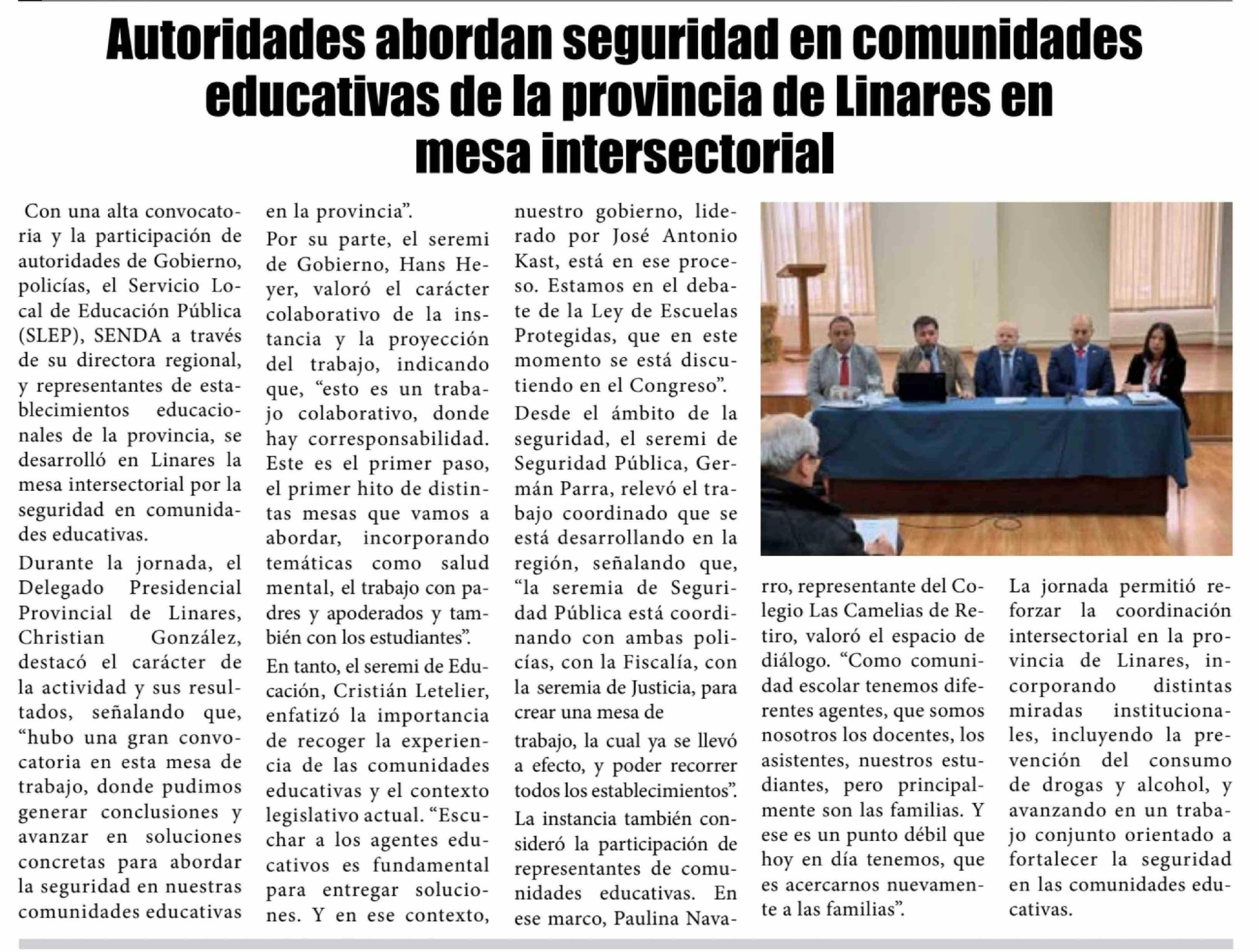 Autoridades abordan seguridad en comunidades educativas de la provincia de Linares en mesa intersectorial 22-04-2026 El Lector |