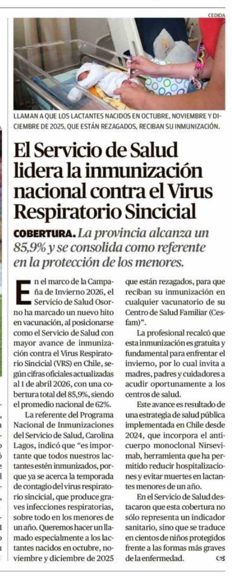 El Servicio de Salud lidera la inmunización nacional contra el Virus Respiratorio Sincicial 05-04-2026 El Austral de Osorno |