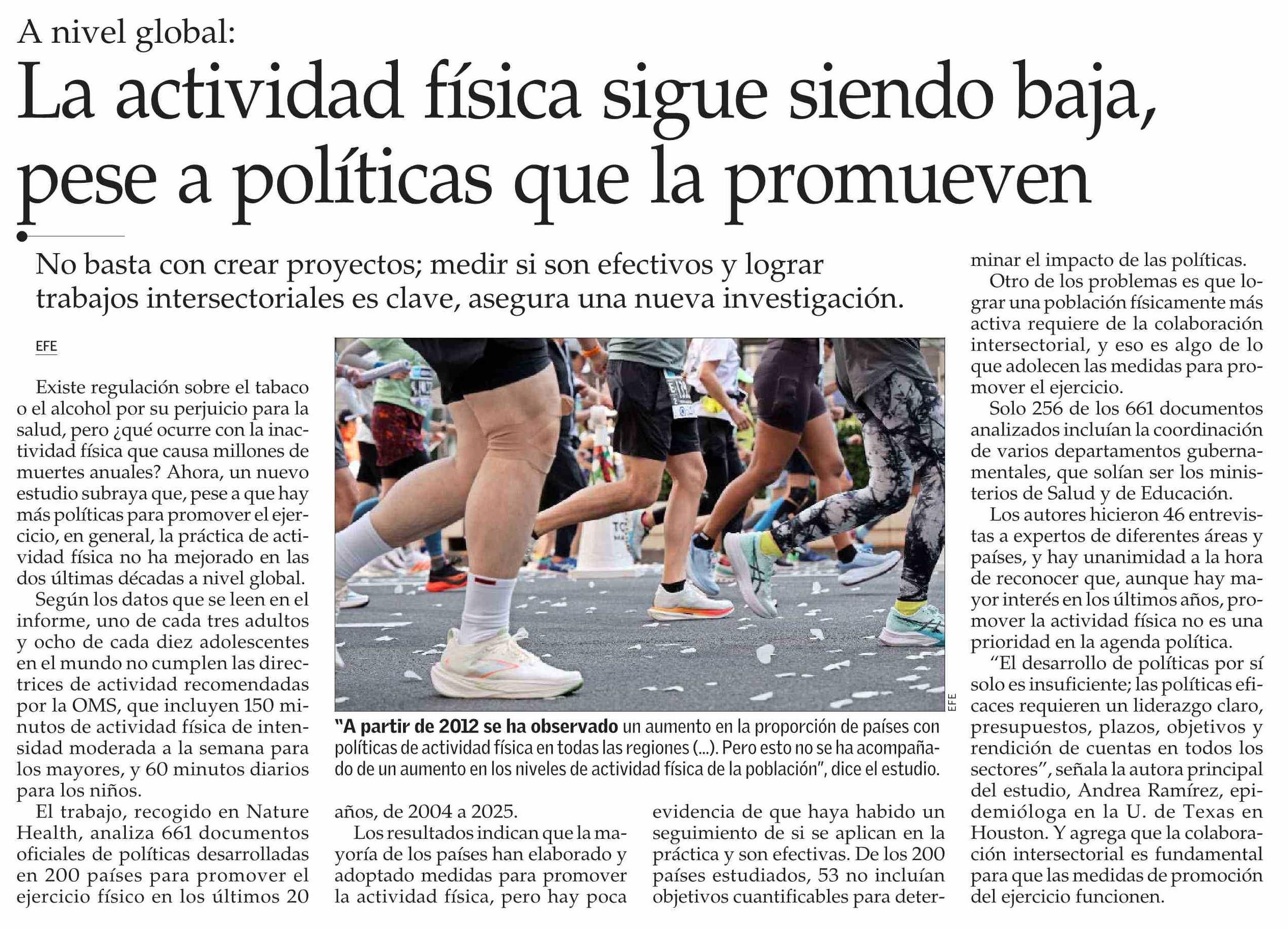 Título: La actividad física sigue siendo baja, pese a políticas que la promueven