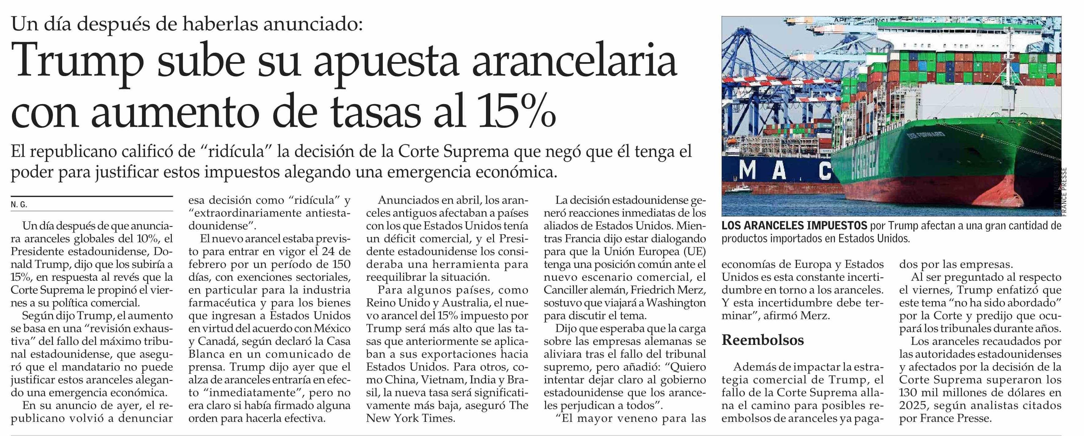 Trump sube su apuesta arancelaria con aumento de tasas al 15% 22-02-2026 El Mercurio |