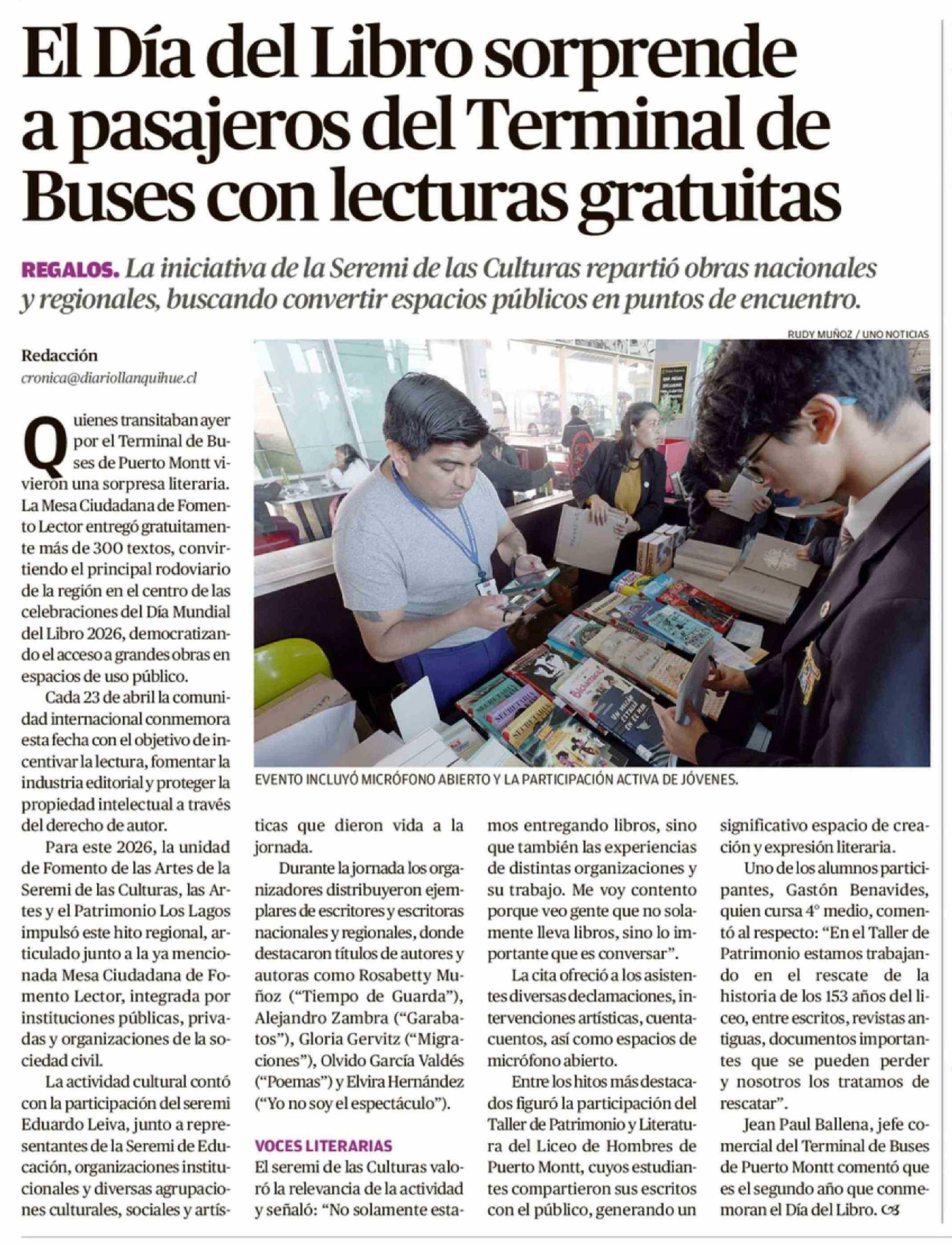 El Día del Libro sorprende a pasajeros del Terminal de Buses con lecturas gratuitas 24-04-2026 El Llanquihue |