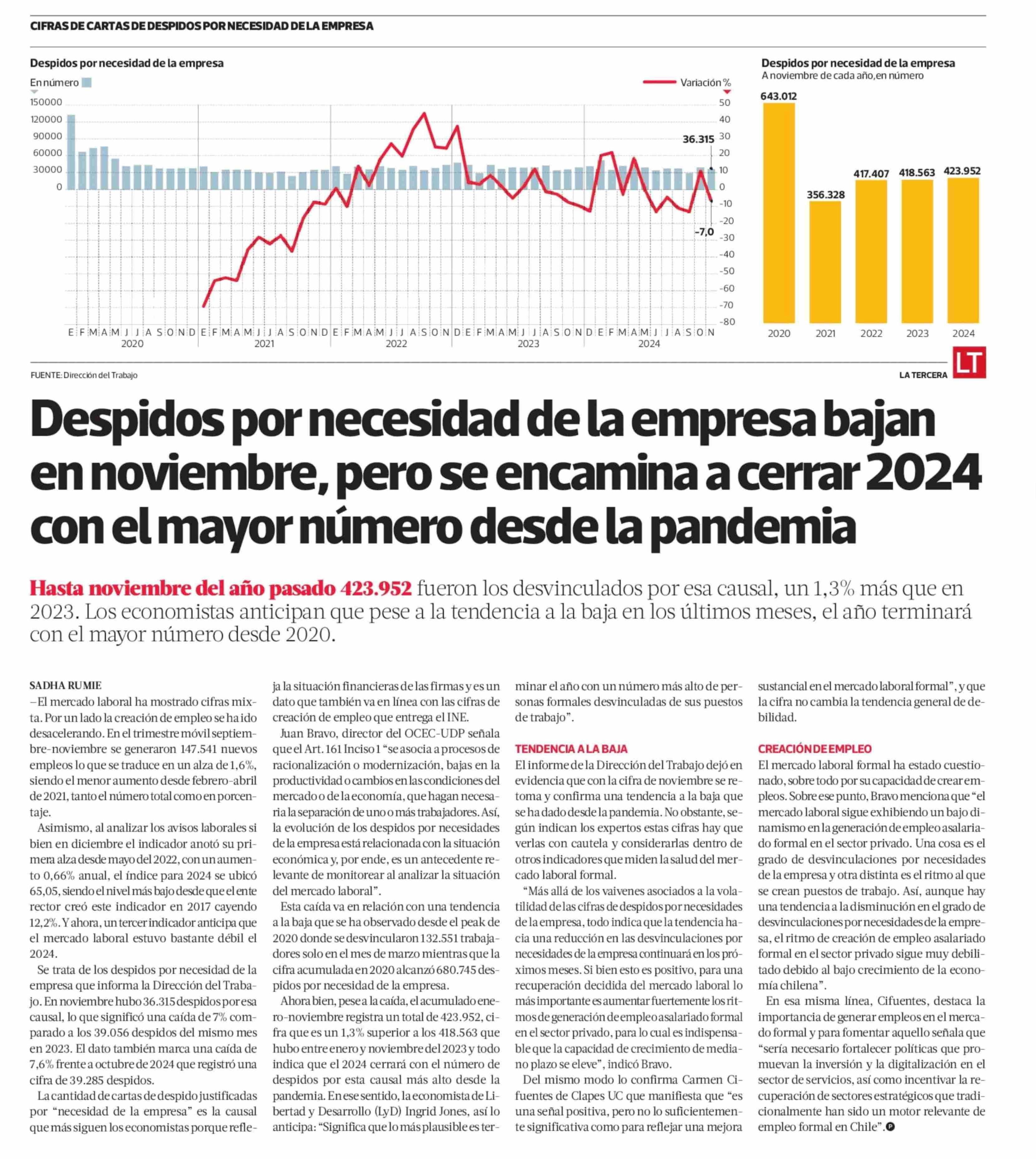 Despidos por necesidad de la empresa bajan en noviembre, pero se encamina a cerrar 2024 con el mayor número desde la pandemia 15-01-2025 La Tercera |