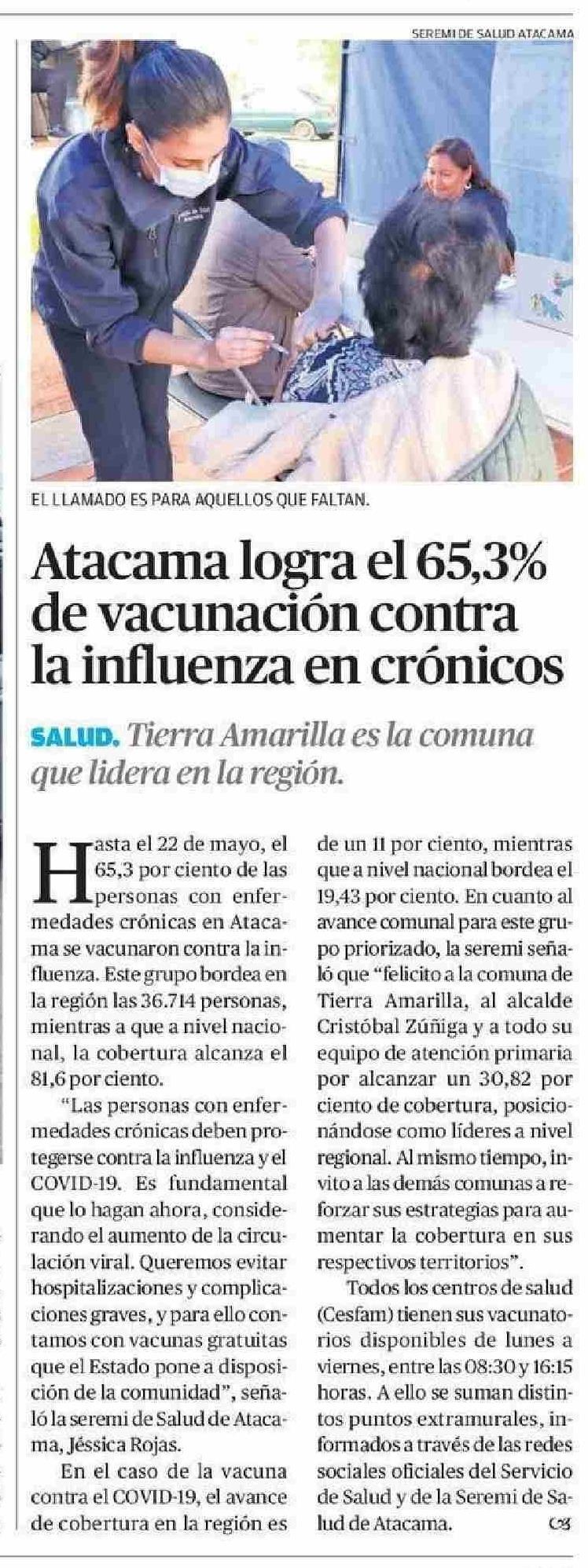 Atacama logra el 65,3% la influenza en crónicos de vacunación contra 27-05-2025 El Diario de Atacama |