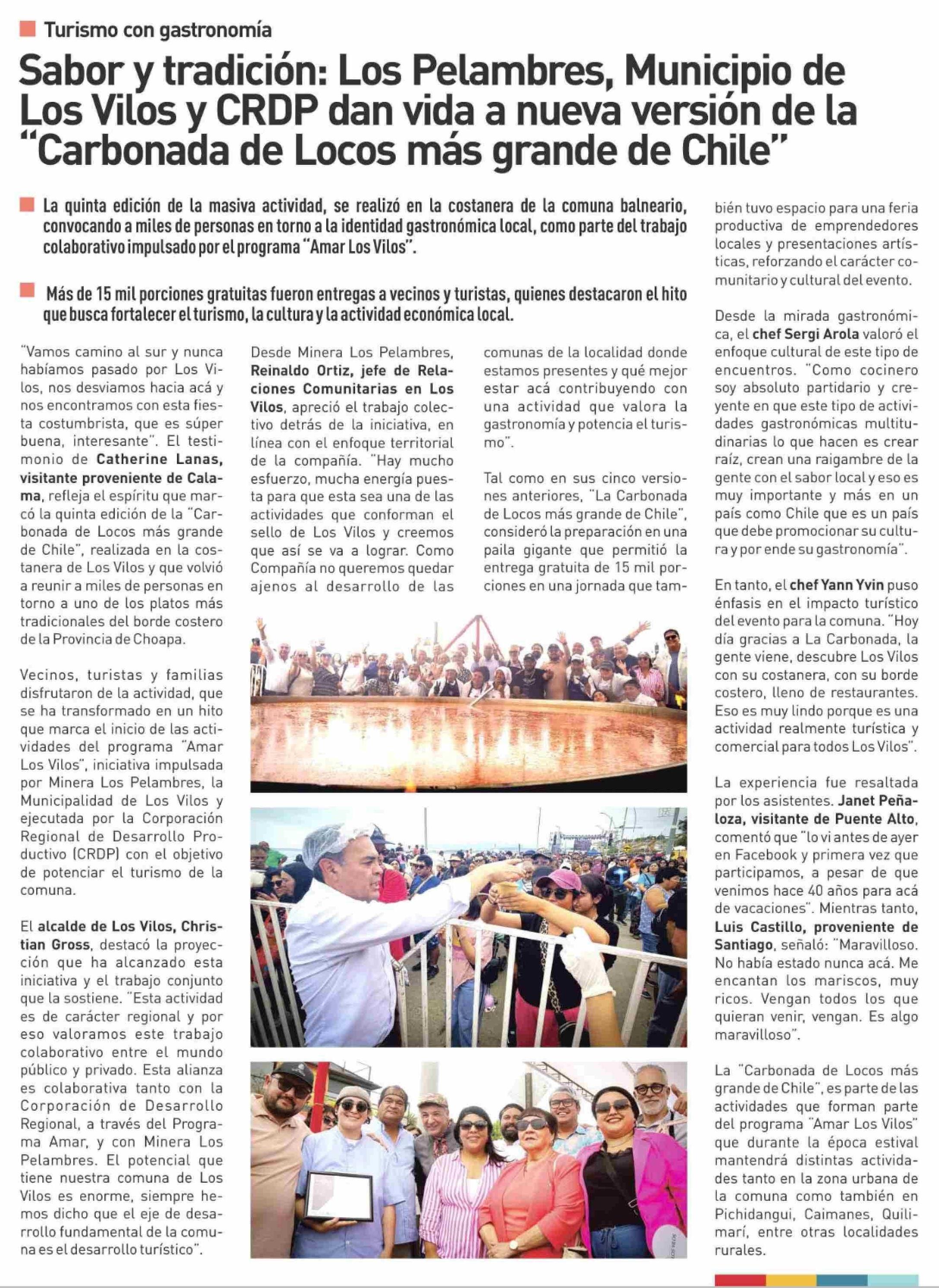 Sabor y tradición: Los Pelambres, Municipio de Los Vilos y CRDP dan vida a nueva version de la "Carbonada de Locos más grande de Chile" 18-01-2026 Diario la Región |
