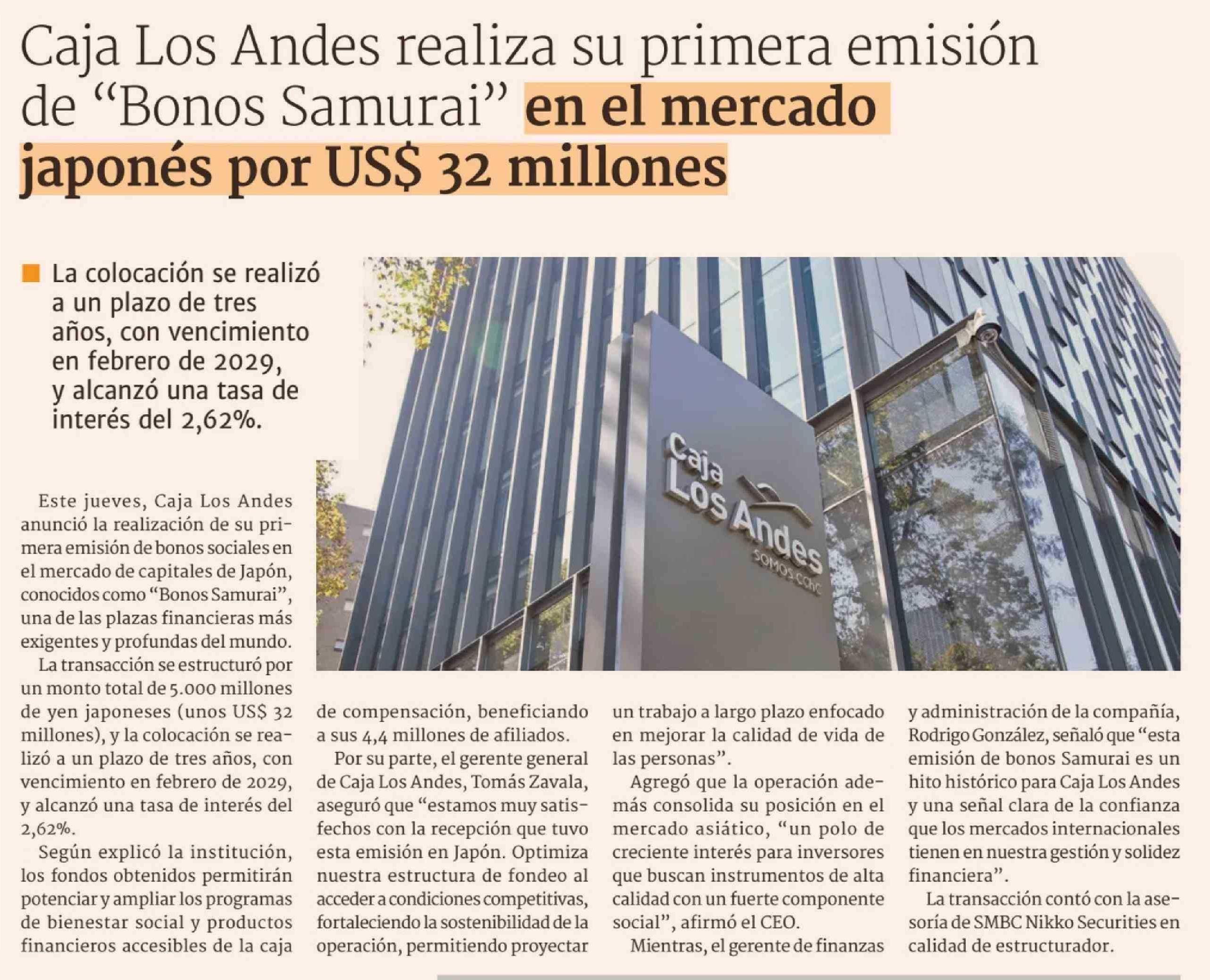 Título: Caja Los Andes realiza su primera emisión de "Bonos Samurai" en el mercado japonés por US$ 32 millones